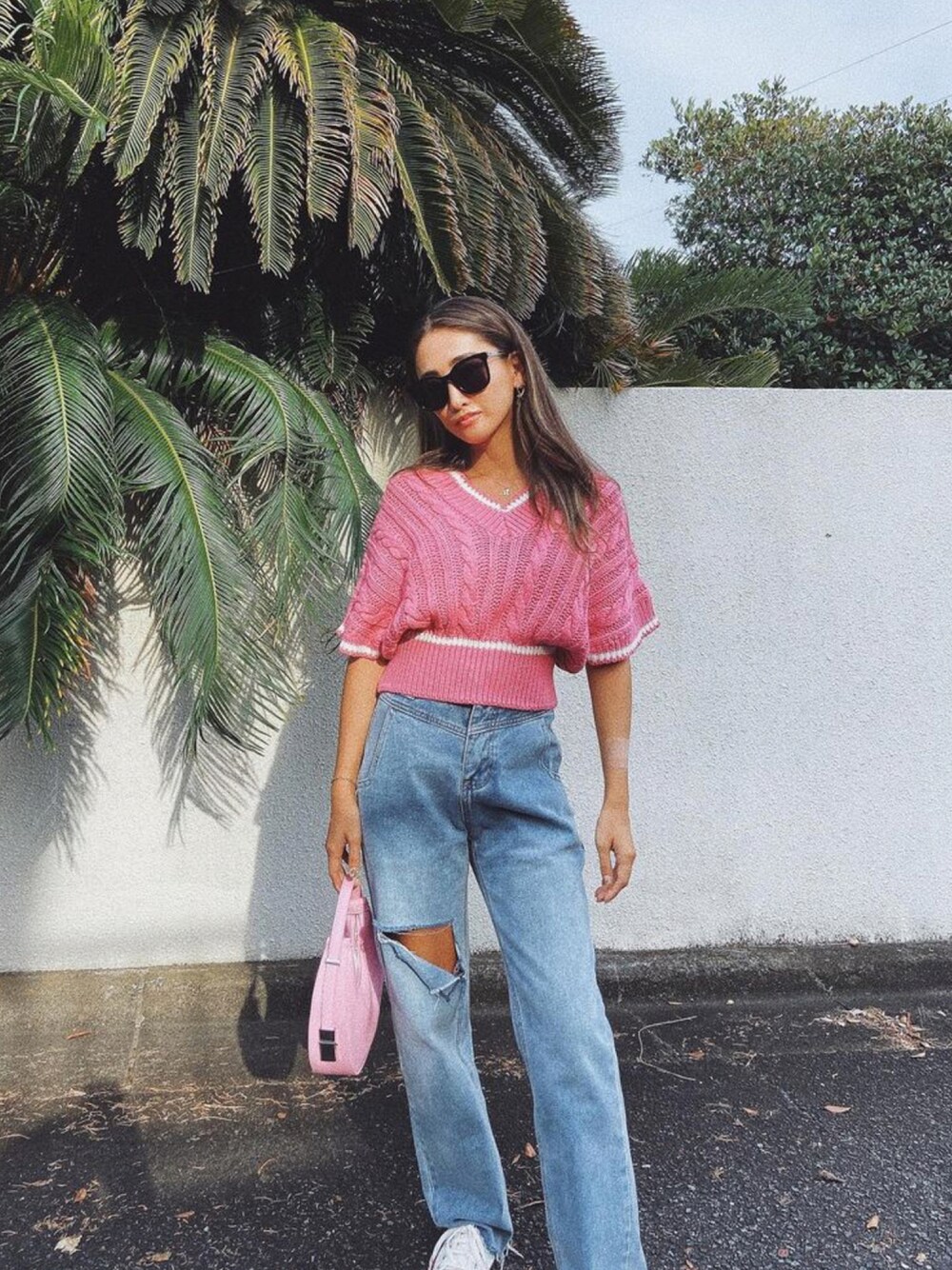 ピンクで可愛い印象のニットベストは、デニムパンツと合わせてカジュアルに💕💕