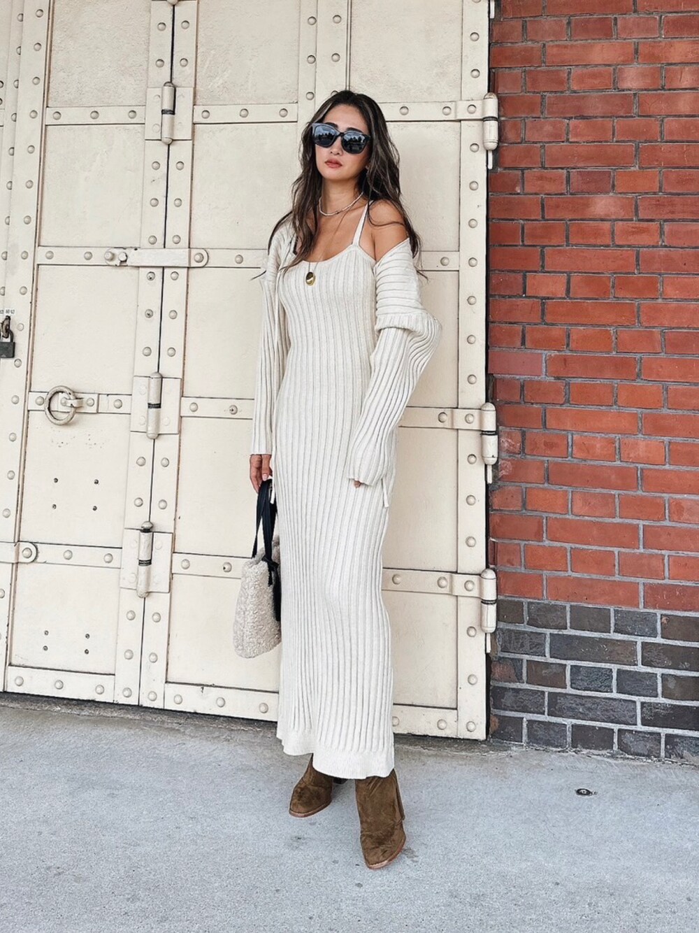 esutoreja 公式のワンピース「カーディガンロングニットワンピース」を使ったコーディネート