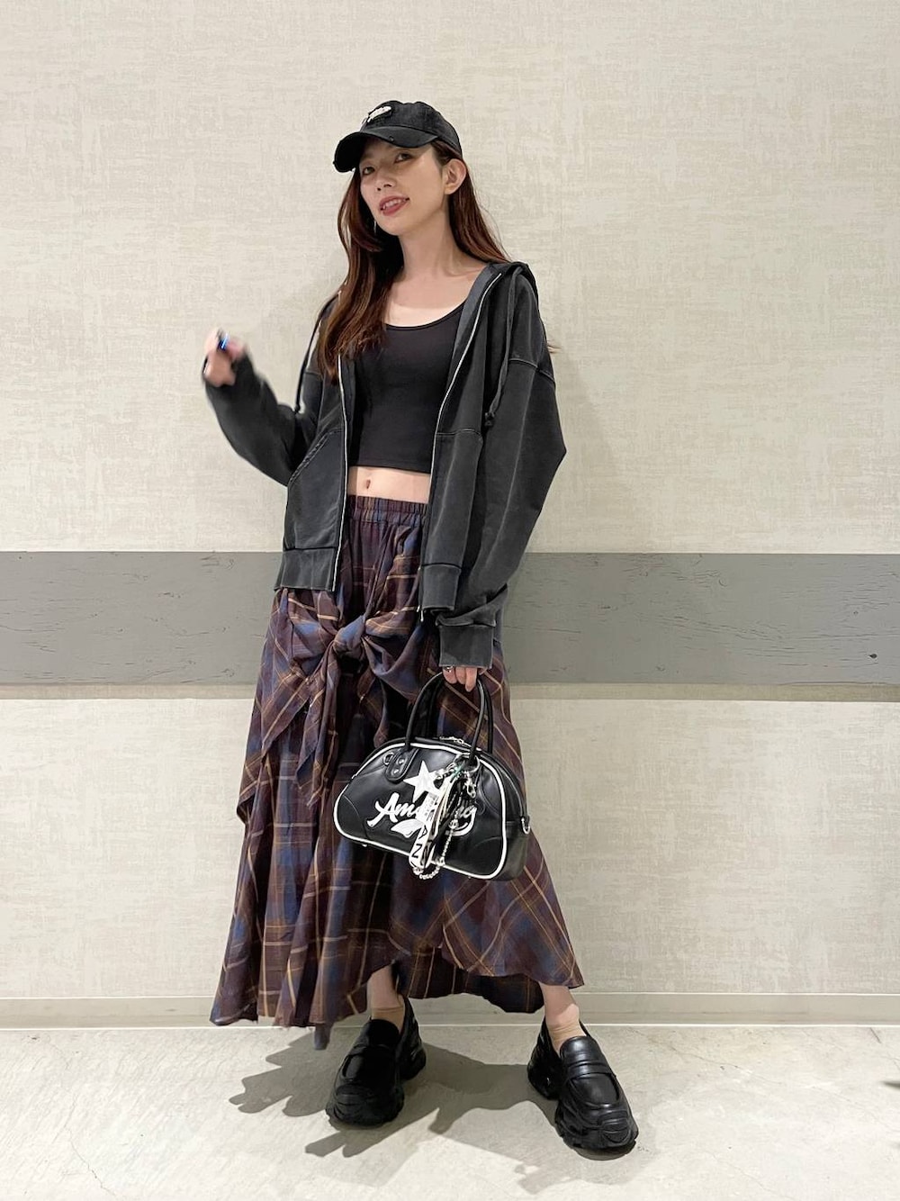 くくってる風のスカートは1枚で主役になります! パーカーはまだ暑いので ざっくり開けてきても可愛いです!