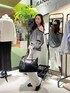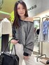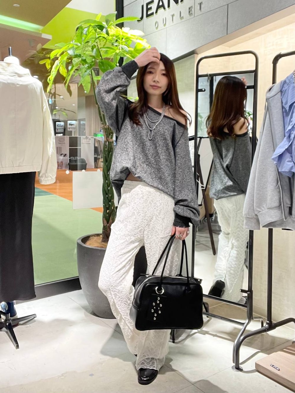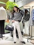 ラメ感ありのトレーナーは 片方ずらしても可愛いです! パンツはほんのりフレアで足細く見えます