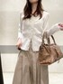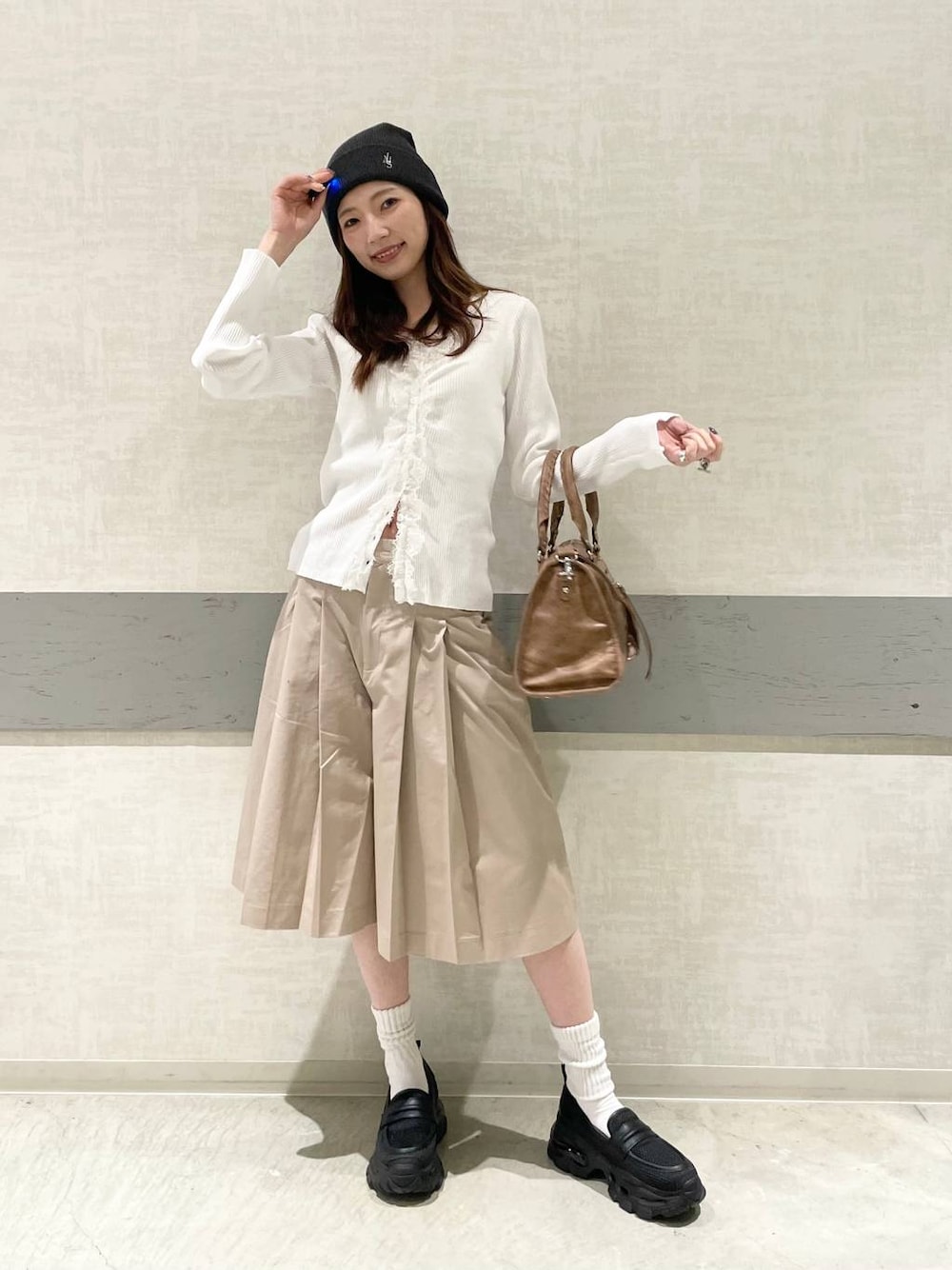 くびれて見えるカーディガンは 下のボタンを開けてきるとスッキリみえます! パンツもタックありなので キレイメなシルエットに。