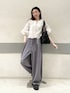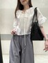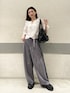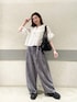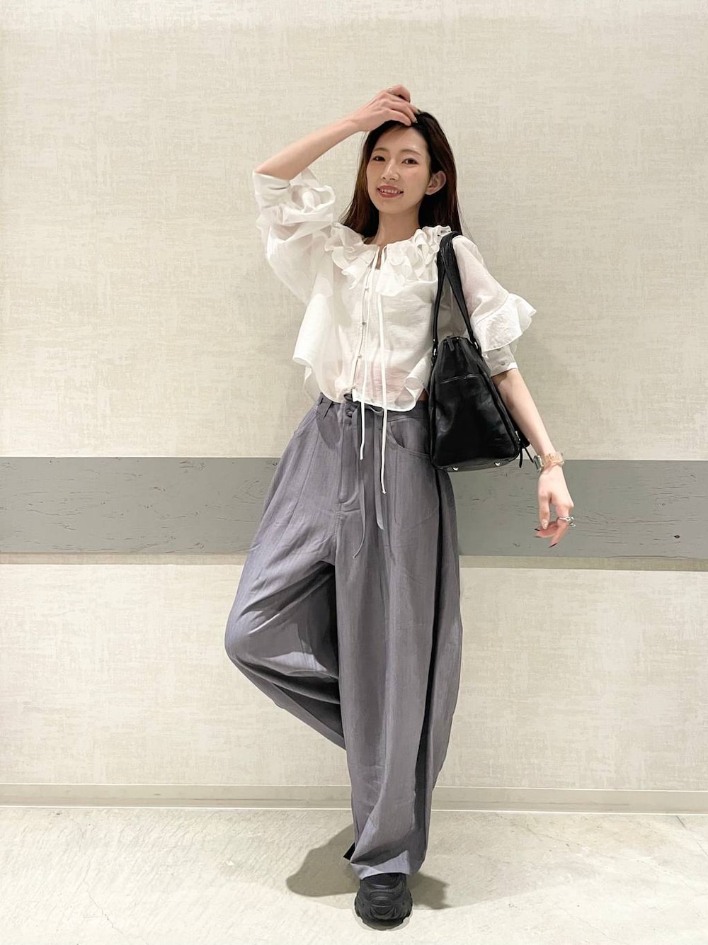 フリルのブラウスは 首元の紐をあけるとスッキリみえます! パンツはコクーンなシルエットです