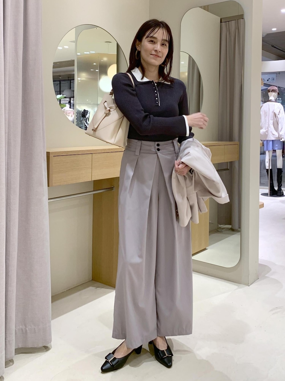 ベーシックで使いやすいグレーとベージュカラー。 かけ合わせると地味になりがちですが、 ダブル襟の白がポイントになり、メリハリをもたせてくれますよ。 お気に入りのスタイリングは、 ♡を押していただければ【お気に入り】から すぐにご覧いただけます◎ 参考にしていただけると嬉しいです。 ____________________ LINEで在庫のお問い合わせや商品、 コーディネートのご相談など 是非お気軽にお問い合わせください◎ LINEで二子玉川ライズVISスタッフにご相談は 【友だち追加】をタップ!! <a href="https://lin.ee/19H7udx"style="background:url(https://scdn.line-apps.com/n/line_add_friends/btn/ja.png); background-size: contain; display: block;width: 116px;height: 36px; margin:.5em 0;"></a>
