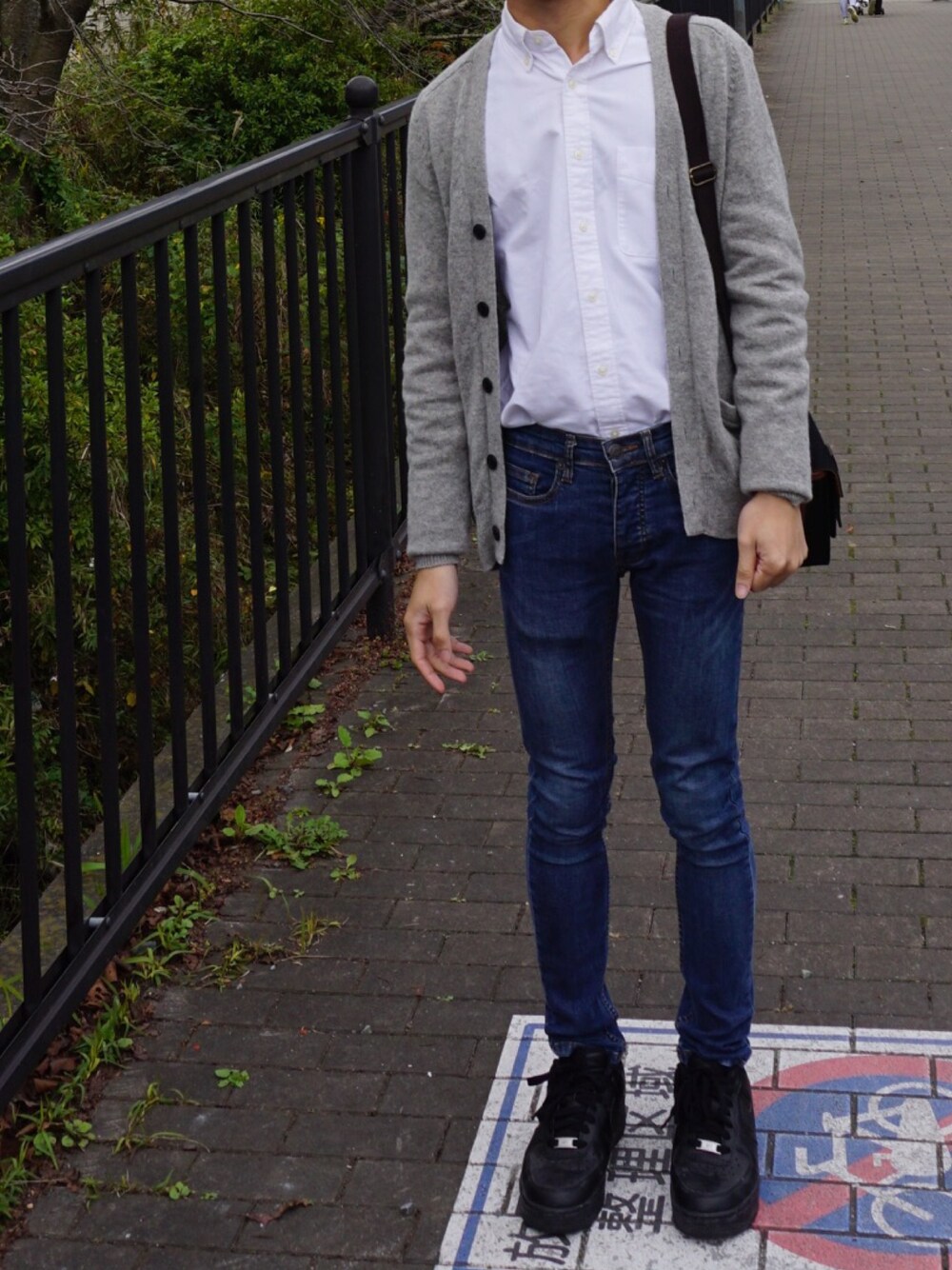 Out in the cold, with a grey wool cardigan and a white shirt. 🍂