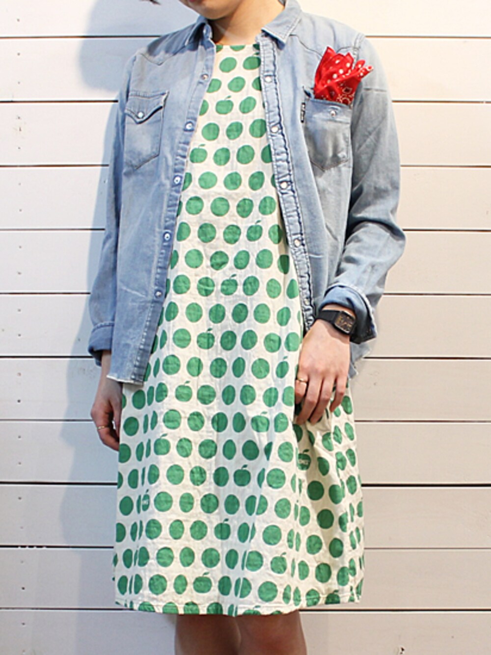 HOMES' UNDER WEAR(ホームズアンダーウエア)より、アップルドットガーゼワンピースのご紹介です! ホームズの新作ワンピースは、大ぶりなドットに隠れたアップルがキュートな1枚! 肌触りの良いふんわりとした生地はダブルガーゼ仕立てで、優しい着心地がポイント! 少し長めの着丈とゆるさの残るサイズ感がリラックスして着られる1枚。どこか懐かしさのあるグリーン×キナリの色合いもホームズらしいデザイン! ノースリーブのデザインは今の時季はカットソーを重ねて、夏場はさらりと1枚で着たいキュートな1枚です! アップルドットガーゼワンピース/HOMES' UNDER WEAR(ホームズアンダーウエア) 販売価格:18,360円(税1,360円)