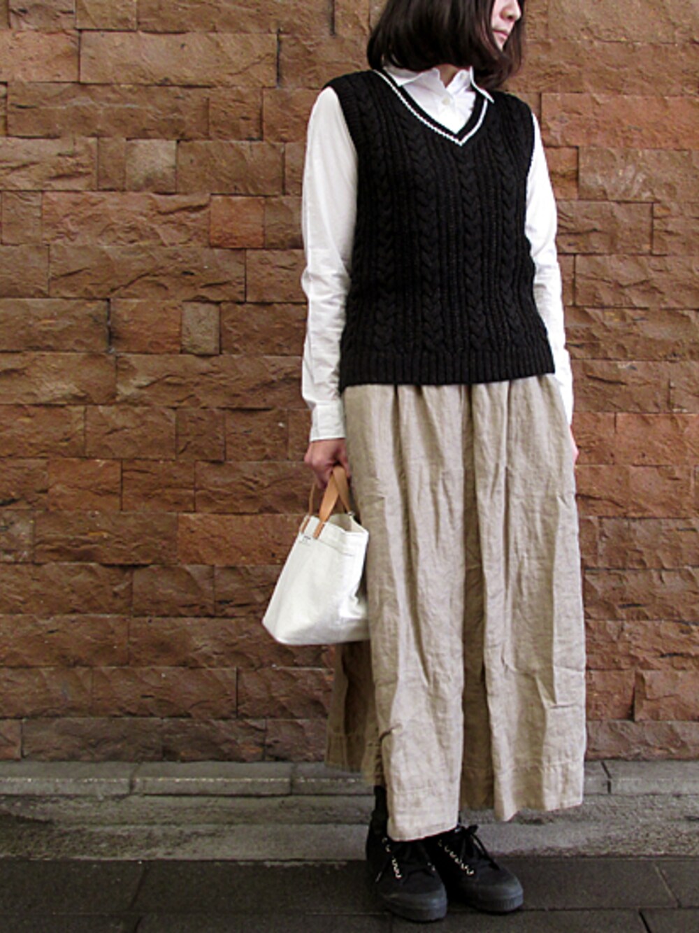 スポーティなニットベストにタック入りスカートをコーディネート。スクールガール風♪