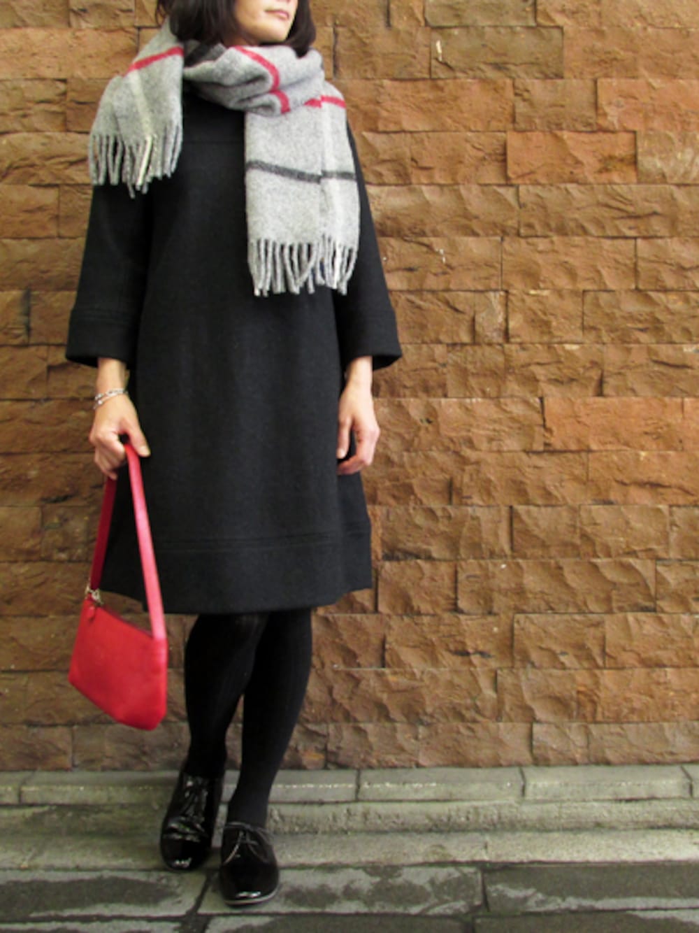 短め丈がかわいいワンピースに冬小物を合わせたきれいめコーデ。
