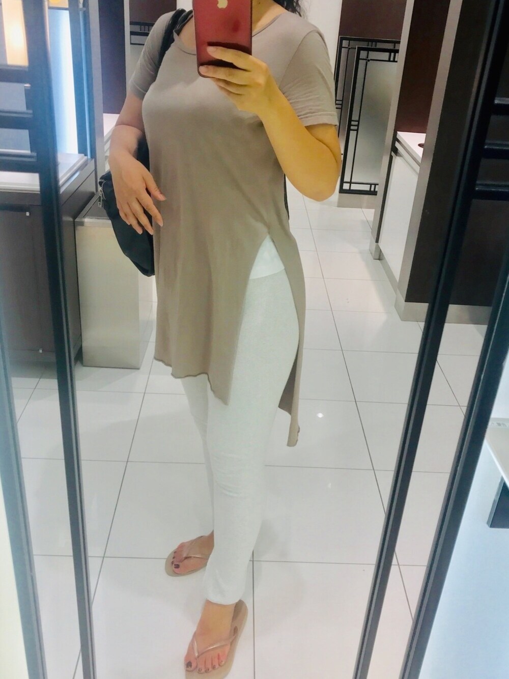 同じトップスが連投になります。 靴を何にしようかなぁと思い、ビーチサンダルにしようと。 ベージュ、グレー、ホワイト、ゴールド ですが、キレイに色でも形でもいい感じになっていると思いますが。