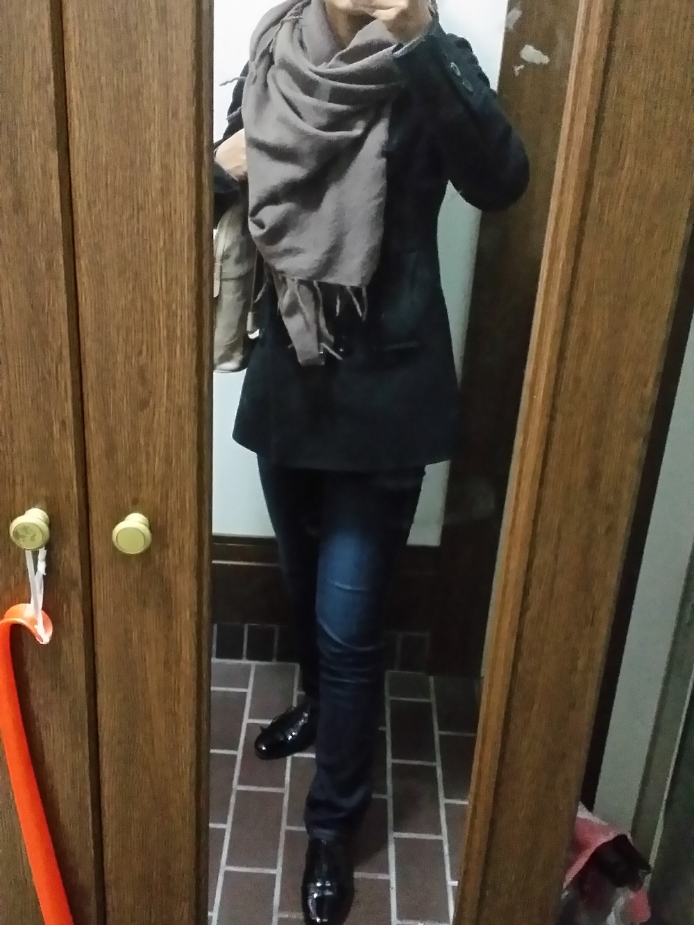 ストール:UNITED ARROWS コート:UNITED ARROWS ニット:BANANA REPUBLIC パンツ:Sweet Camel バッグ:SAZAVY