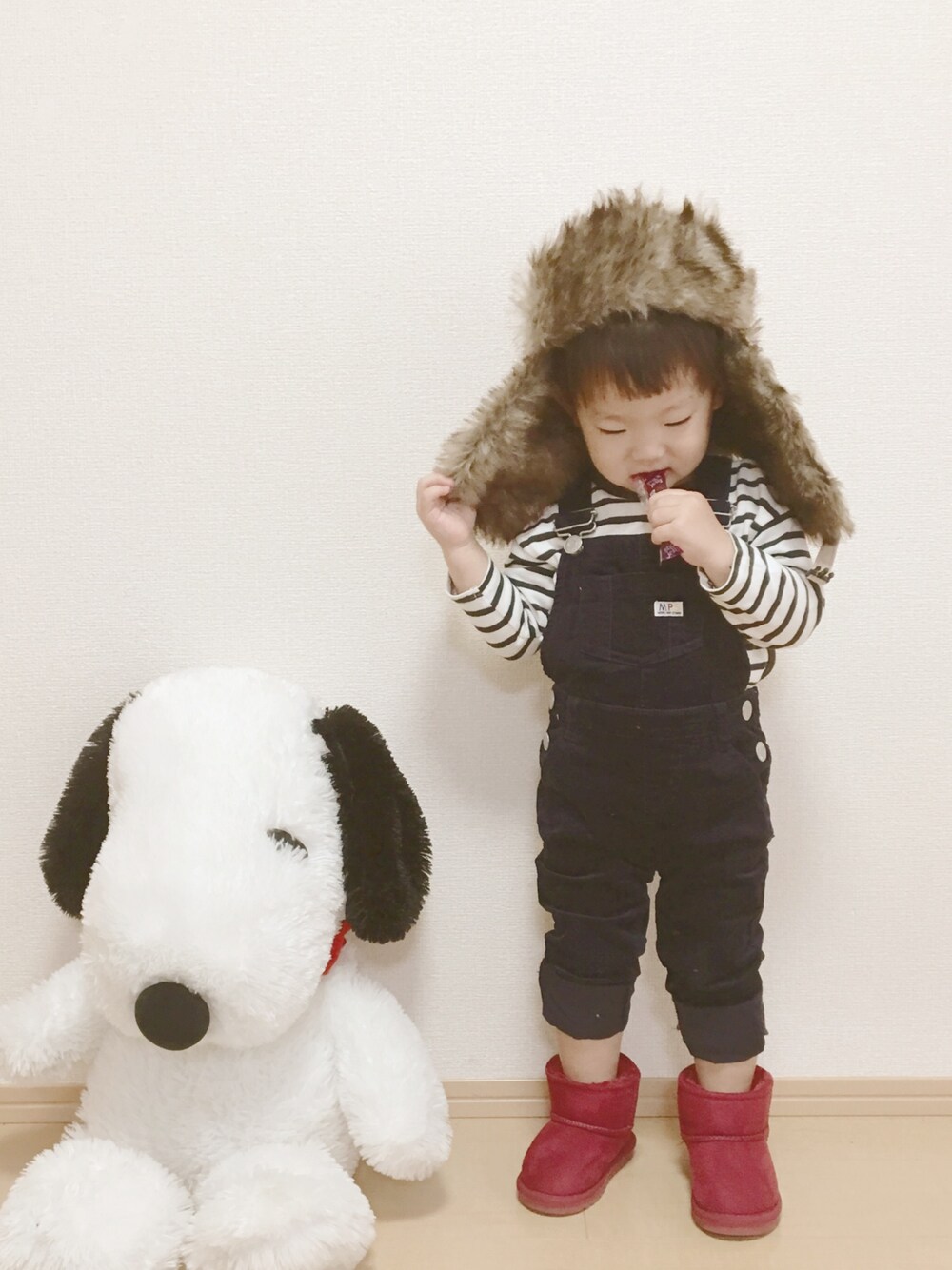 今日のコーデ❤️ サロペットにフライトキャップ合わせたくて😊 (ママのやけど←) お出かけのときは去年のダッフル着て行ったよ〜〜
