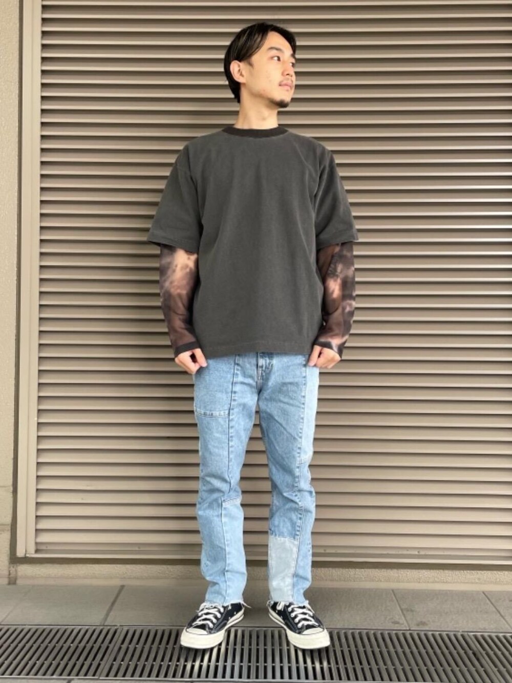 ●身長:173cm ●普段サイズ:アウターL/ボトムスS シューズ27cm 【サイズ感】 トップス:ややゆったり インナー:ややゆったり 【素材感】 トップス:コットン100% インナー:ナイロン55% ポリエステル45% 【着心地】 程よく緩いシルエットで、通気性もあり快適な着心地です。 【コーディネートポイント】 シンプルなスタイリングの中でもインナーに透け感のあるカットソーを着用しにアクセントをつけました。 透け感を生かして無地やプリントTシャツの上に合わせるのもおすすめです。