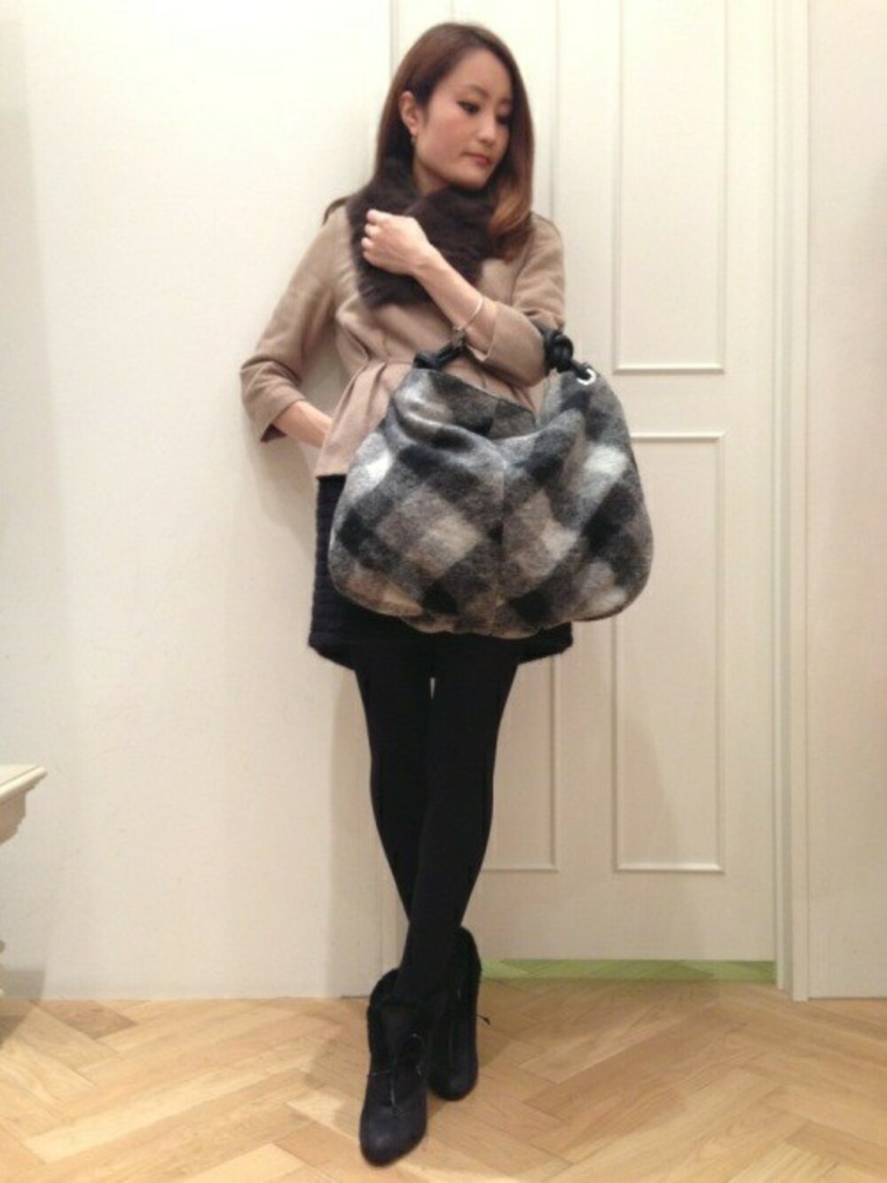 人気のペプラムトップスを使った、大人フェミニンな冬スタイル♪ シルエットにこだわったペプラムトップスは、女性らしいキレイなラインが特徴です。 アンゴラ混のふんわりスカートを合わせて、上品かつフェミニンに仕上げました。 【Teresa Cambi】のバッグはトレンドのチェック柄、ふわふわの素材感が今の気分にぴったりです。 冬のお出かけは、ファー小物やボアブーツをプラスして温かみのある雰囲気に♪♪