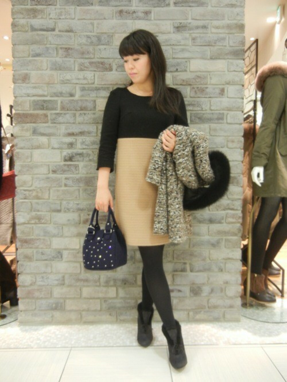 今年トレンドのハイウエストのデザインが特徴のワンピースで決める、大人のクラシカルスタイル♪ アンゴラ混の“ふんわ~り”とした優しい素材感でフェミニンな印象に。 シンプルで合わせやすいデザインなので、デイリーからお出かけにと大活躍してくれます◎ ラインストーンを散りばめた【bonfanti】のフエルトバッグで遊び心をプラスしてみました♪ 人気の【CORSO ROMA 9】のボアブーツはショート丈なので上品な足元に仕上がります。