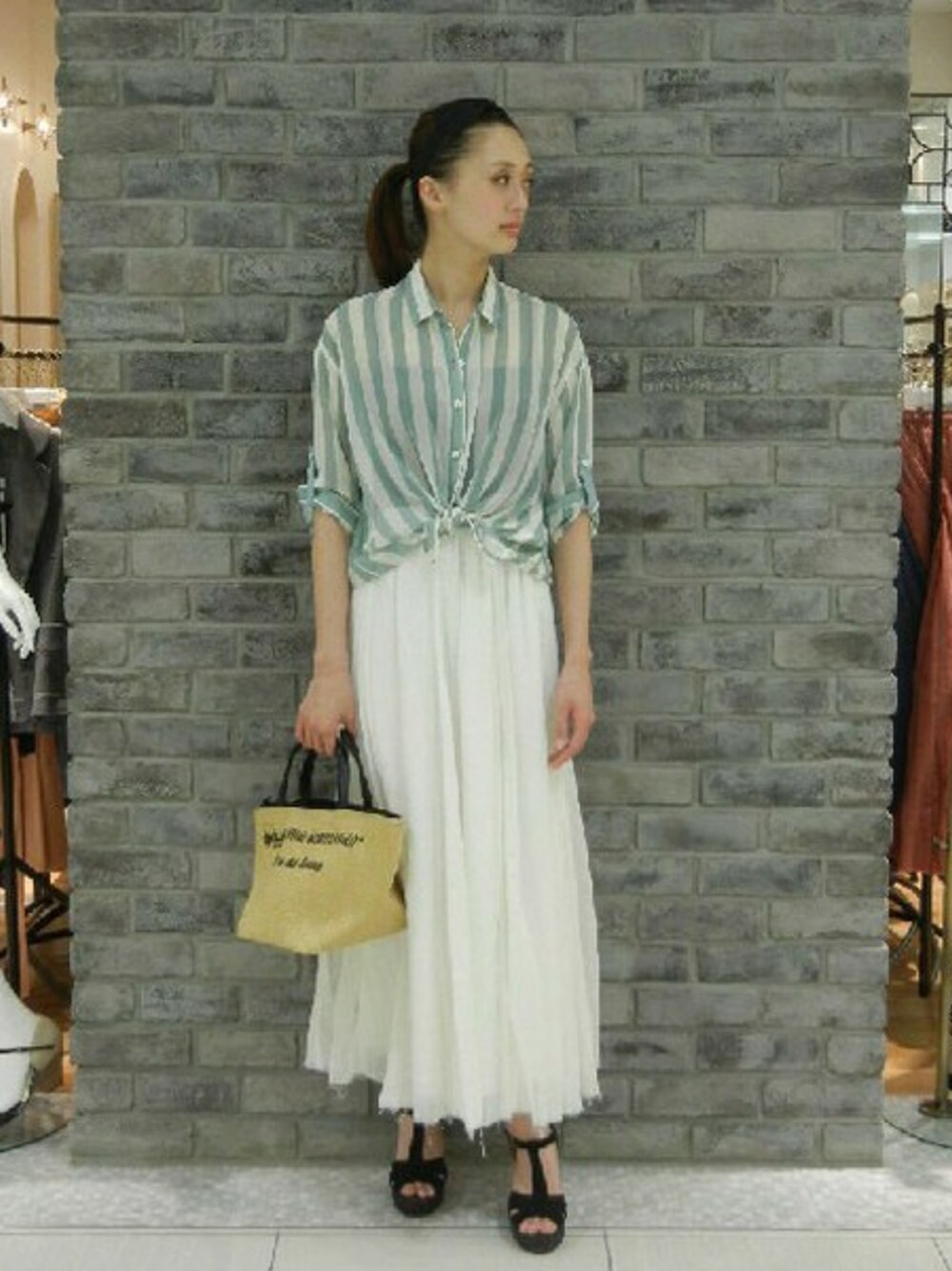 トレンドのストライプシャツにマキシスカートを合わせて、フレンチマリンなムードが漂うスタイリングに仕上げました。 分量感のあるマキシスカートが女性らしさをUPさせてくれます♪ 淡いトーンのコーデは、小物でアクセントを効かせて引き締めるのがポイント!