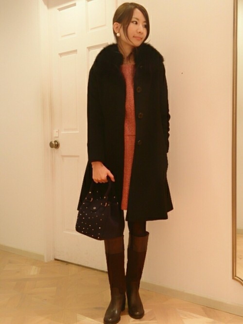 イベントシーズン真っ只中!!な12月のお出かけにオススメのおめかしスタイル♪ 最高級カシミヤを100%使用したなめらかな手触りのコートは、暖かいうえに非常に軽いのが特徴です。 襟元にはボリューミーなFOXファーをあしらい、上品な雰囲気に・・・♪ インにはシルエットの綺麗なツイードワンピースを入れて、ほんのりトレンド感をプラスしました。 まばゆい輝きを見せるラインストーンを散りばめた【bonfanti】のバッグがアクセント。