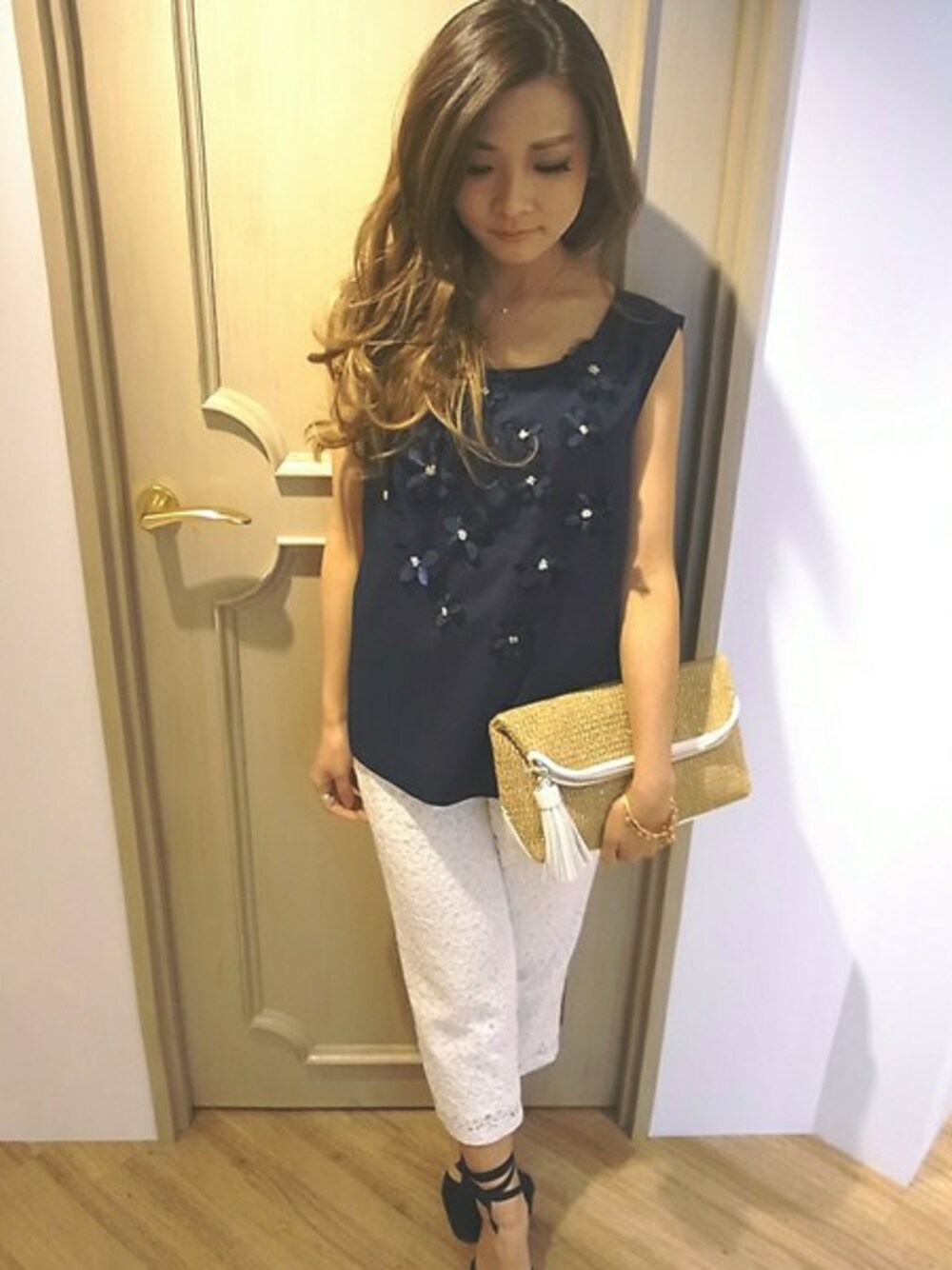 Navy×Whiteのカラーバランスが爽やかなパンツコーデに、トレンド感たっぷりのレースやフラワーをプラスした遊び心のある大人の休日コーデ。 リゾートムードを高めてくれるバッグ&サンダルが、こなれた着こなしにみせてくれるポイントです☆