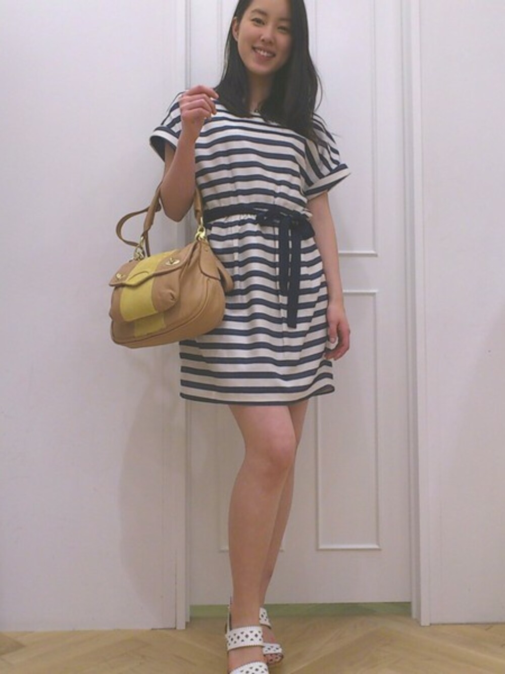 大人かわいいボーダーワンピースでクラシカルマリンな気分に♪♪♪ ウエストできゅっとリボンを結んで、女性らしいシルエットを強調しました。 爽やかなホワイトカラーのサンダルとバッグのイエローを効かせて、夏らしいスタイリングに仕上げています。