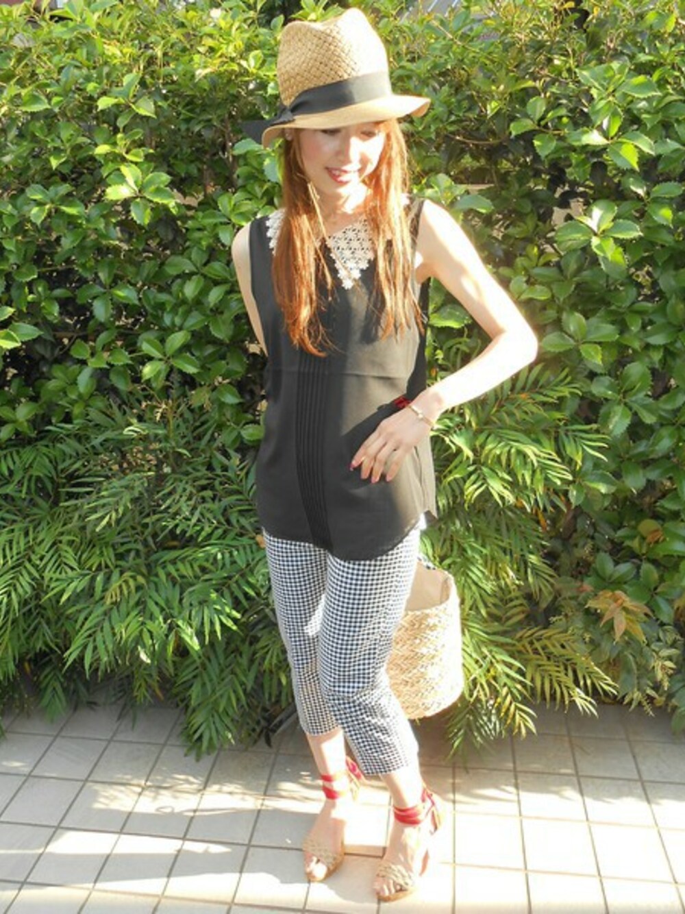 人気イギリスブランド【Darling】の大人可愛いレース襟ブラウスに、シックなギンガムチェックのクロップドパンツを合わせた正統派コーデ。 ナチュラルテイストの夏小物をプラスして、今年らしい“こなれ感”のある着こなしにしました。 サンダルのレッドがアクセントに効いています♪