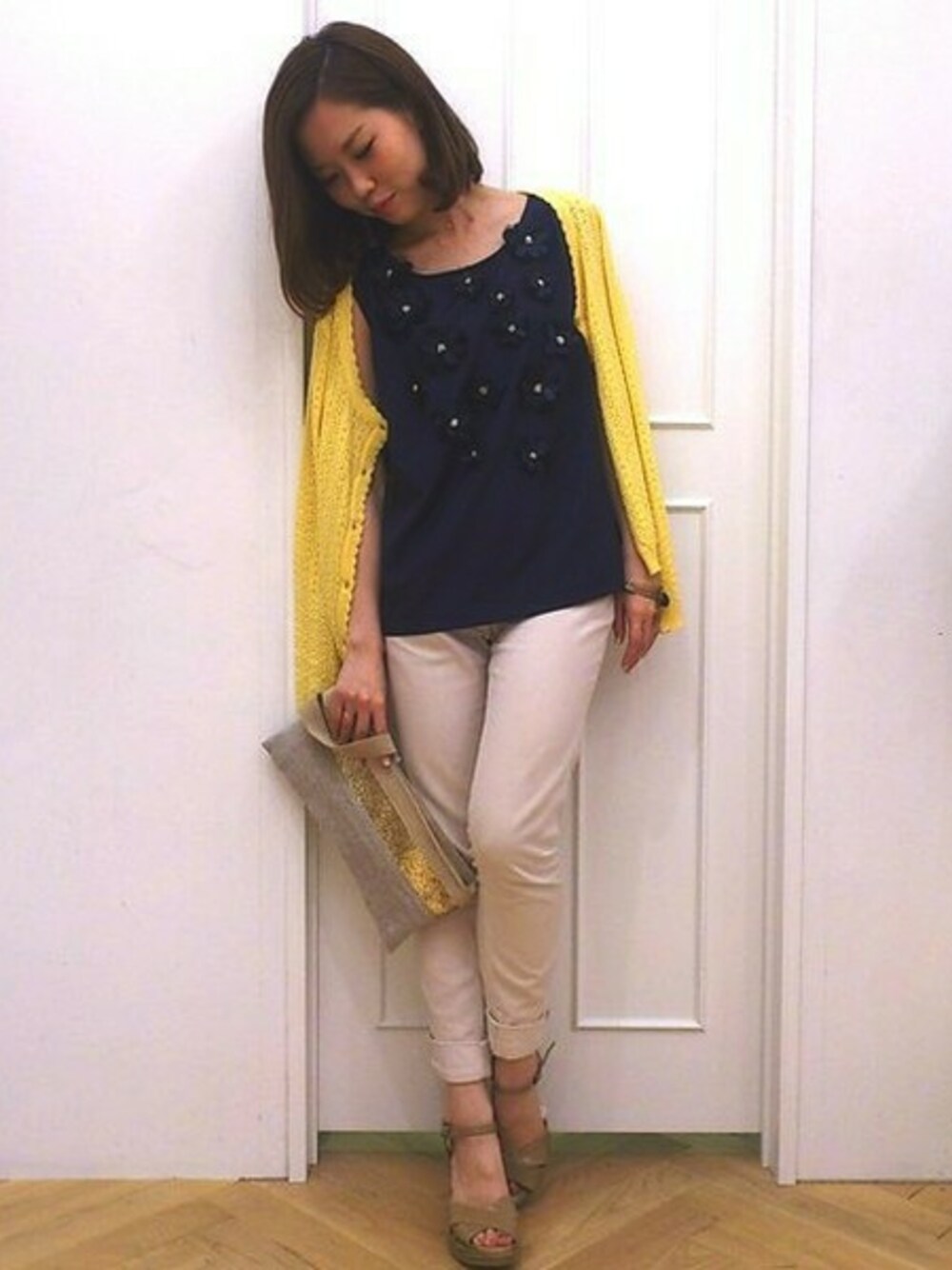 繊細なチュールフラワーが散りばめられたフェミニンブラウスにカラースキニーを合わせて、上品なカジュアルスタイルに仕上げました。 アクセントにもなるイエローのカーディガンを肩にかけて、おしゃれな大人の雰囲気を演出。 存在感のあるバッグとサンダルは、同系色でまとめてスッキリとさせて◎