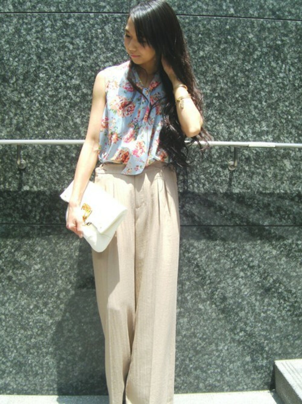 爽やかなフラワープリントブラウスにバギーパンツを合わせ、大人の余裕を感じさせるリラックススタイルに仕上げました♪ フェミニンなボウタイブラウスもシンプルバギーを合わせると、凛とした大人の表情に。 人気の【URBAN EXPRESSIONS】のクラッチは、夏らしくアイボリーをチョイス♪♪