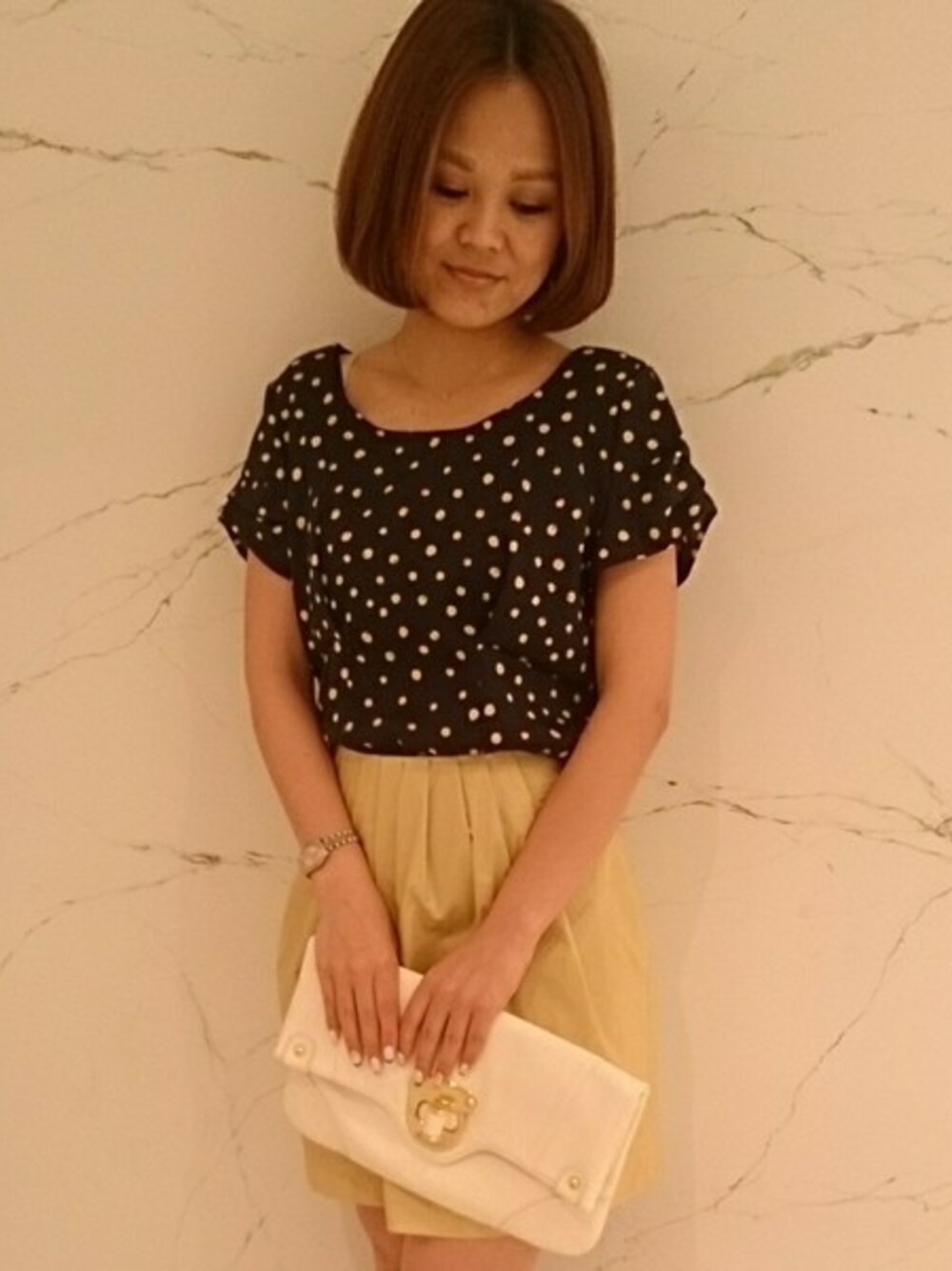 フェミニンなデザインのブラウスに、キレイなカラーリングのタックスカートを合わせた大人のトレンドスタイル☆ ブラウスはお袖のタックデザインとバックリボンがポイント。 発色の良いイエローのスカートが今年らしさをグッと引き立ててくれます。 お洋服が主役なので、足元とバッグはシンプルに。