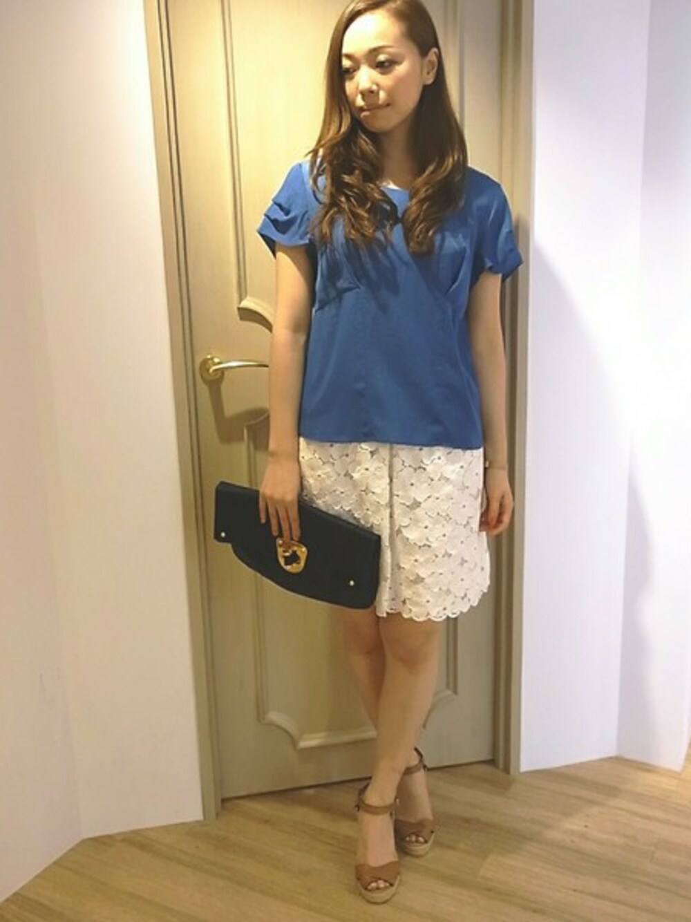 お袖のタックデザインがフェミニンなブラウスは、バックリボン付きで後ろ姿も可愛さアピール☆ 今シーズンのトレンドでもあるレースのスカートを合わせて、今年らしい着こなしに。 Blue×Whiteの色合わせで、清潔感のある爽やかな印象にしました。 人気のクラッチを合わせれれば、大人のこなれ感を演出できます♪