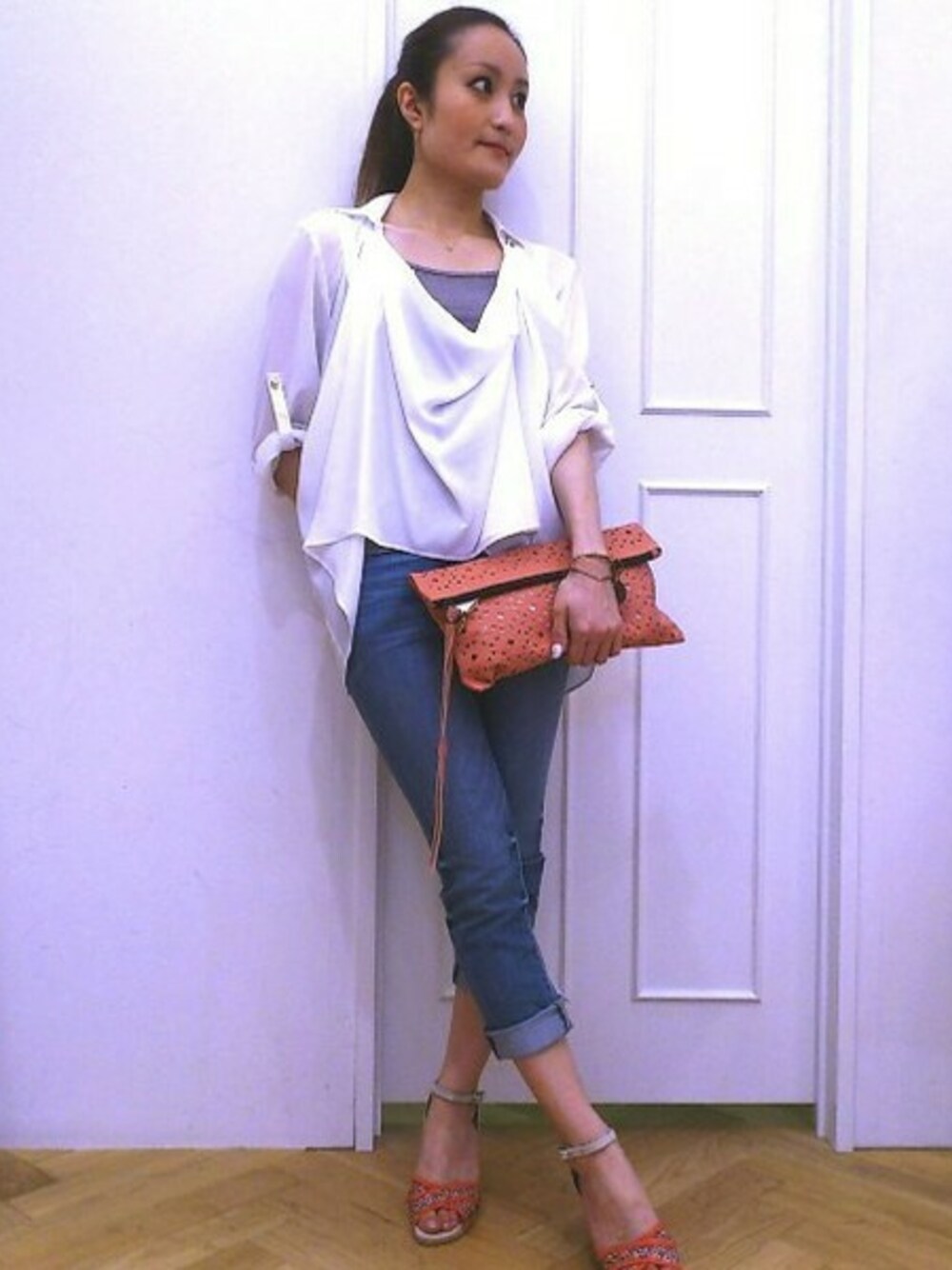 エレガントな雰囲気の2WAYチュニックで仕上げた、大人のシンプルカジュアル。 しなやかな素材感が作り出す優雅なドレープが、上品ながらもこなれた雰囲気を引き立ててくれます。 フロントボタンのかけ替えで、雰囲気を変えて着こなせるのもポイント! シルエットのキレイなデニムパンツで足首を見せて、女性らしく。 カラー小物を合わせて、大人の遊び心をアピールしてみました♪♪