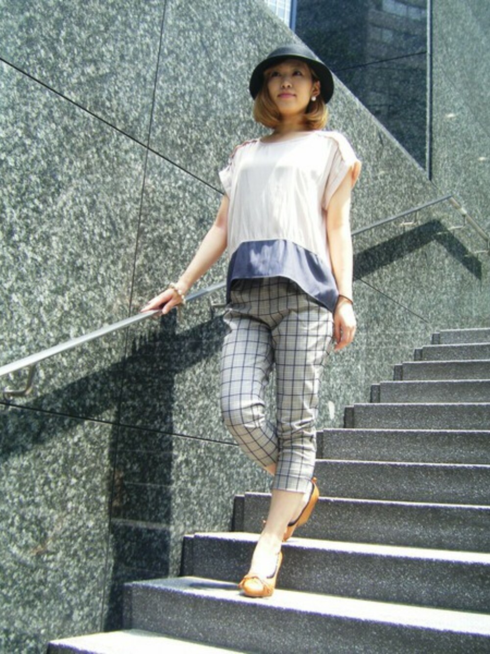 今シーズンのトレンドであるバイカラーブラウスにチェックパンツを合わせて、 こなれ感たっぷりな大人のカジュアルスタイルの完成です♪ 合わせやすい落ち着いたカラーの配色と、光沢感のある素材で大人っぽく。 カジュアルなイメージのチェック柄のクロップドパンツも、 トップスとカラートーンを合わせると落ち着いた雰囲気に着こなせます。 足首をきゅっと細く見せるために、足元はヒールのパンプスで引き締めました。