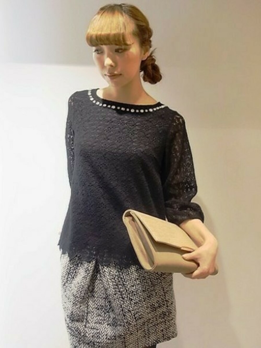 表情を華やかに見せてくれるビジュー付きのレースブラウスに、イタリアンジャガードを使用したコクーンスカートでスッキリ大人っぽく仕上げました♪ トレンドの“ビジュー”使いで今年らしい着こなしが決まります。 イタリアのインポートファブリックを使用したスカートは、リュクスなムードを高めてくれる素材感がポイント。 人気の【DANIELLE NICOLE】のクラッチを合わせてこなれ感をプラスしました。 デイリーにはもちろん、パーティーシーンにもオススメです。