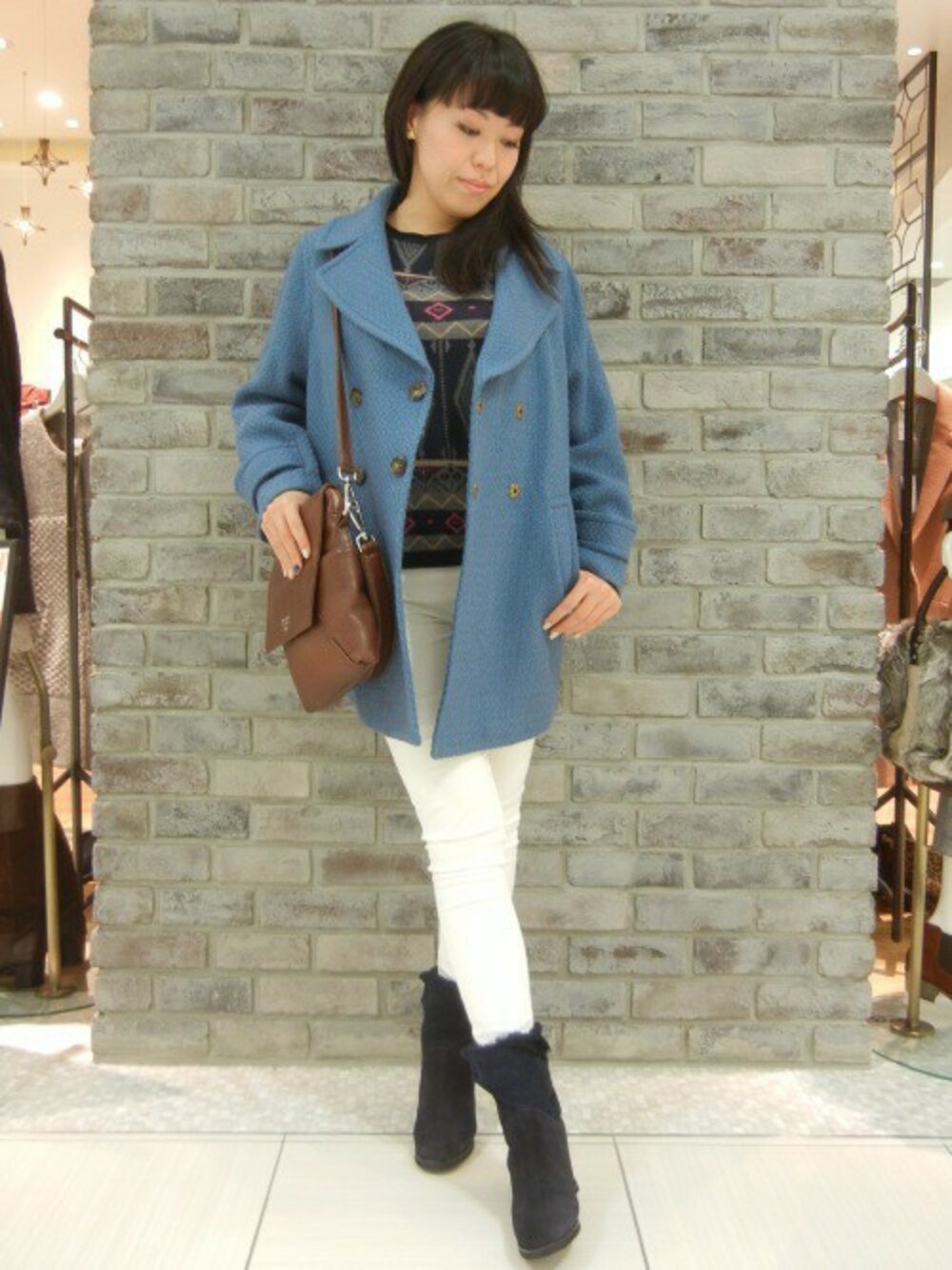 今年らしい素材感がのキレイ色コートがポイントの冬スタイル。 トレンドのビッグシルエットコートは、大きすぎない適度なゆるさが大人っぽく決めるポイントです。 冬の着こなしに映えるキレイなブルーが目を惹きます♪ ホワイトカラーのスキニーを合わせてクリーンにまとめました。 白を取り入れた冬スタイルは女子力UP確実です♪♪