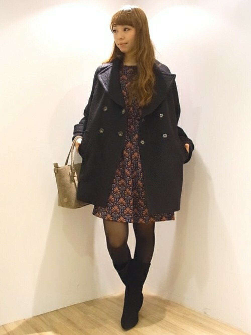 ゆったりしたコクーンシルエット可愛らしいコートをポイントにした、冬のデイリースタイル。 トレンドのビッグシルエットで一気に今年らしい印象に・・・! 印象的なレトロ柄が大人フェミニンなワンピースをインに入れて、暗くなりがちな冬コーデを明るく仕上げました。 ラインストーンが煌めく可愛らしいフエルトバッグでスタイリングに抜け感をプラス。