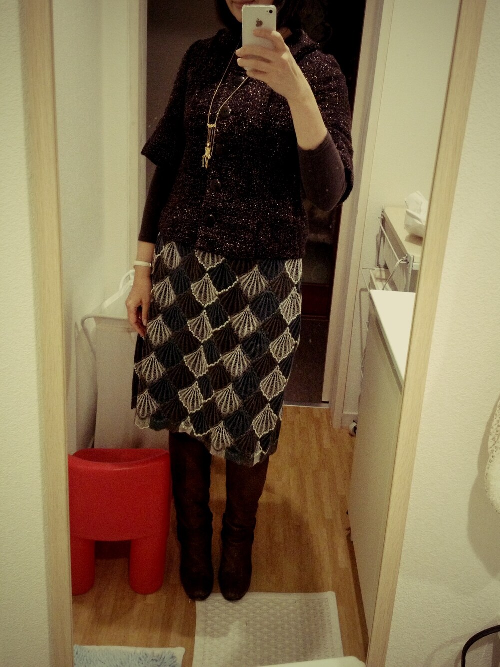 実はこのジャケット、もともとついてた袖のリブが気に入らなくて外してしまいました。 スカートもボリュームがありすぎて幼かったので、ストレートな膝丈にリフォームしています。 洋服は着てみて気に入らないところがあれば、大胆にカスタムします。