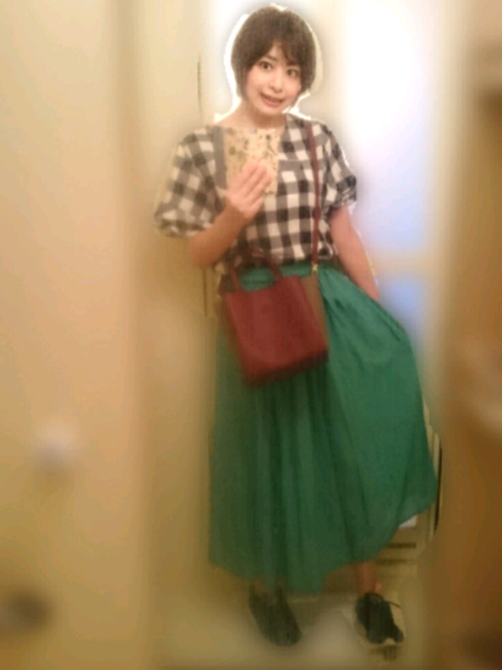 こんばんは⭐ 閲覧ありがとうございます🎵 トップスは以前載せたヤツの着回しです。 スカートのグリーンが綺麗でテンション上がります😁