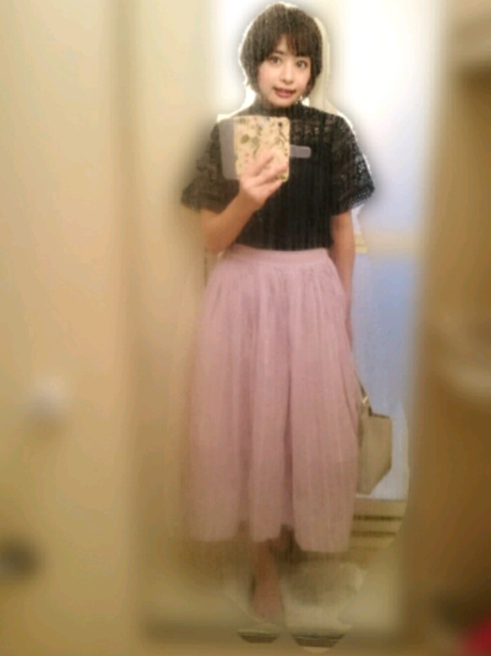 こんばんは⭐ 閲覧やいいね♥ありがとうございます😊 今日は、ラベンダー色のスカートが甘くなりすぎないように、黒トップスで引き締めてみました☺