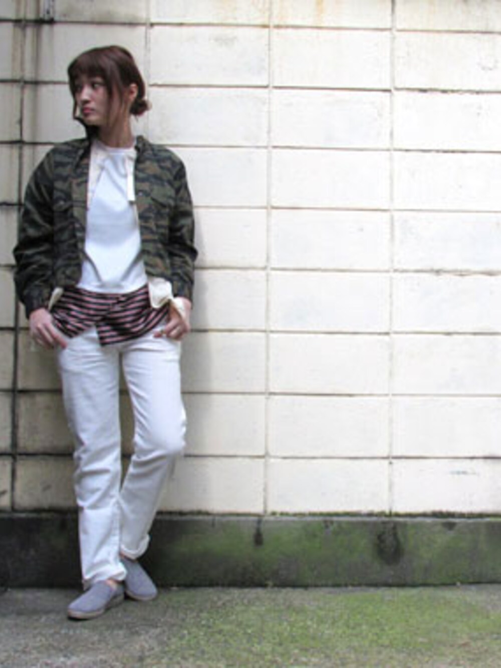 タイガーストライプのシャツ×ヘンリーネックのリメイクジャケット 中はカットソーの着心地なので羽織りやすく、バランスのとりやすい丈感に♪ いかつくなりすぎないカーブを描いた袖のデザインで肩幅の気になる方にもオススメです 甘めなワンピースとあわせるのも◎ ・レイヤードジャケット 77circa(77サーカ) ¥19,000(+税)