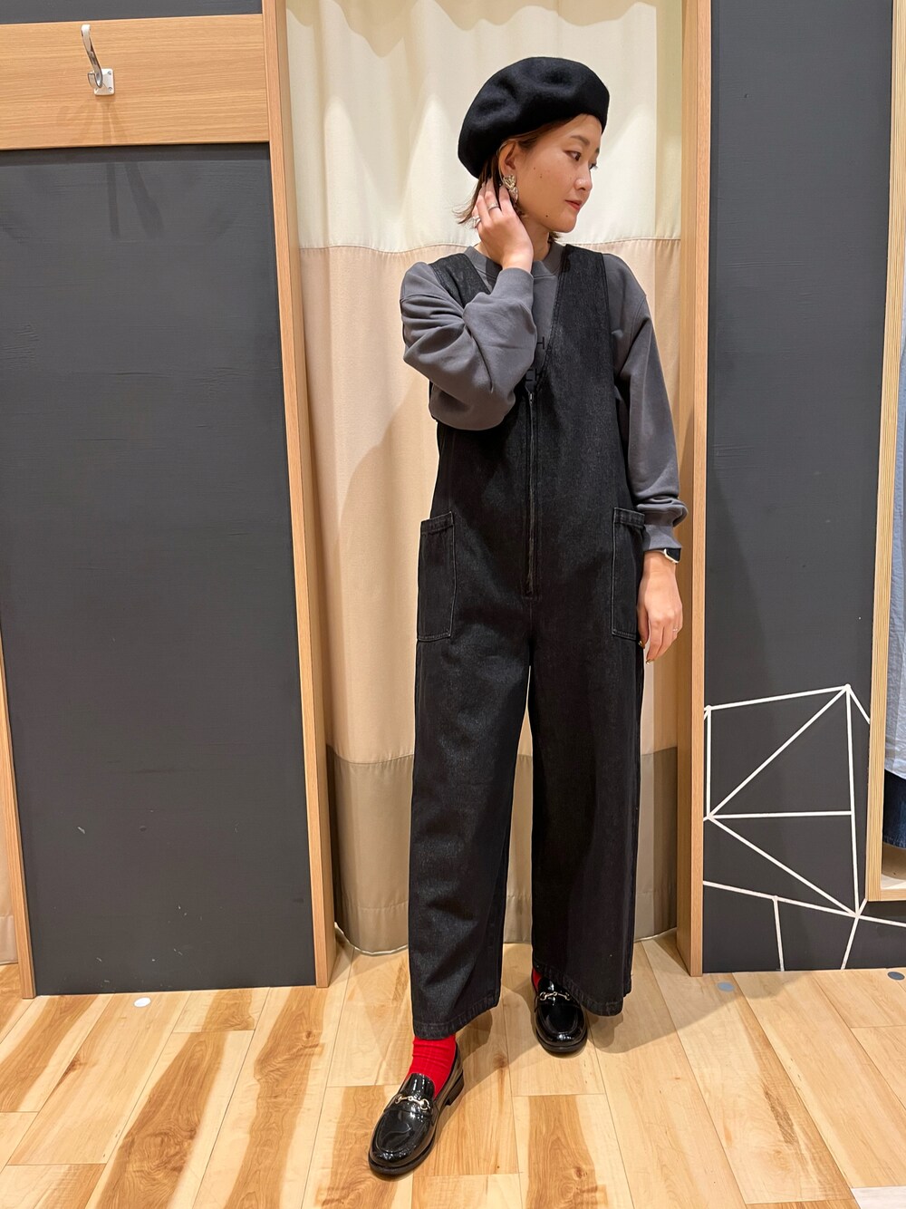 デニムサロペットにロゴスウェットを合わせてパンプスに赤ソックスでキレイめに着ました*・゜ フロントジップのサロペットなので着脱もしやすいです*・゜