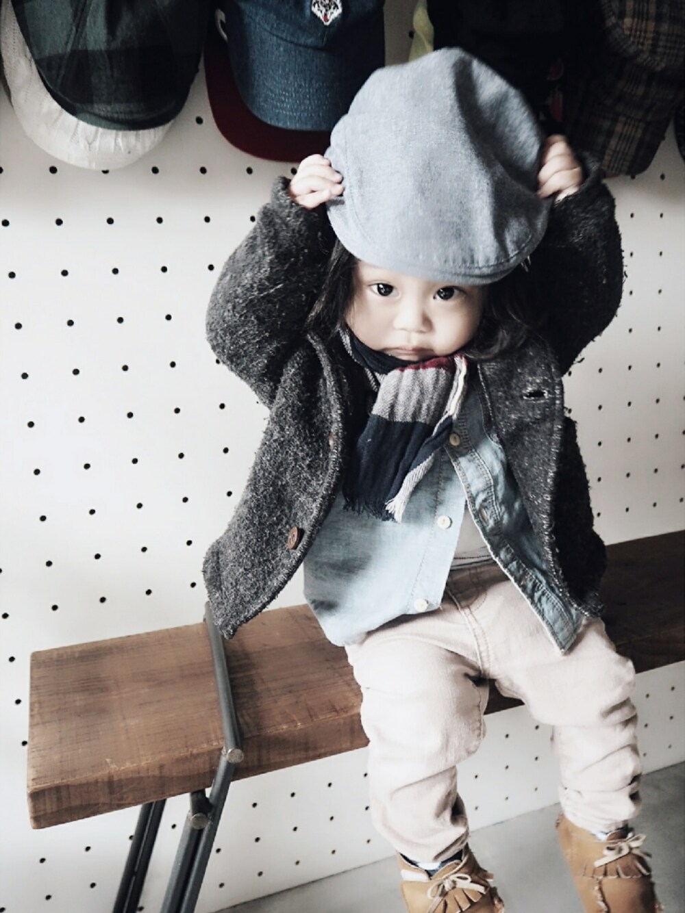 ブルー系のシャツ/ブラウス、ピンク系のパンツ、ブルー系のハンチング/ベレー帽を着用したキッズの春コーディネートの1枚目の写真
