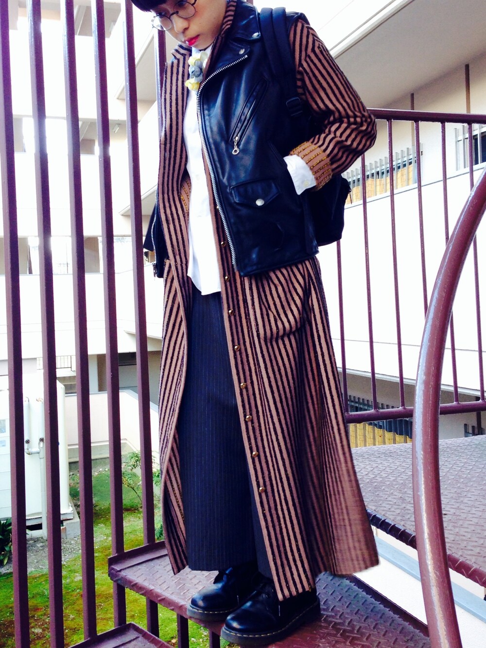 ガウン/マザー 白シャツ/ブラックコムデギャルソン ワイドパンツ/ビュルデサボン コサージュ/マザー ブーツ/Dr.Martin 眼鏡/井戸多美男作 袖を切ったショットのライダース、重い。