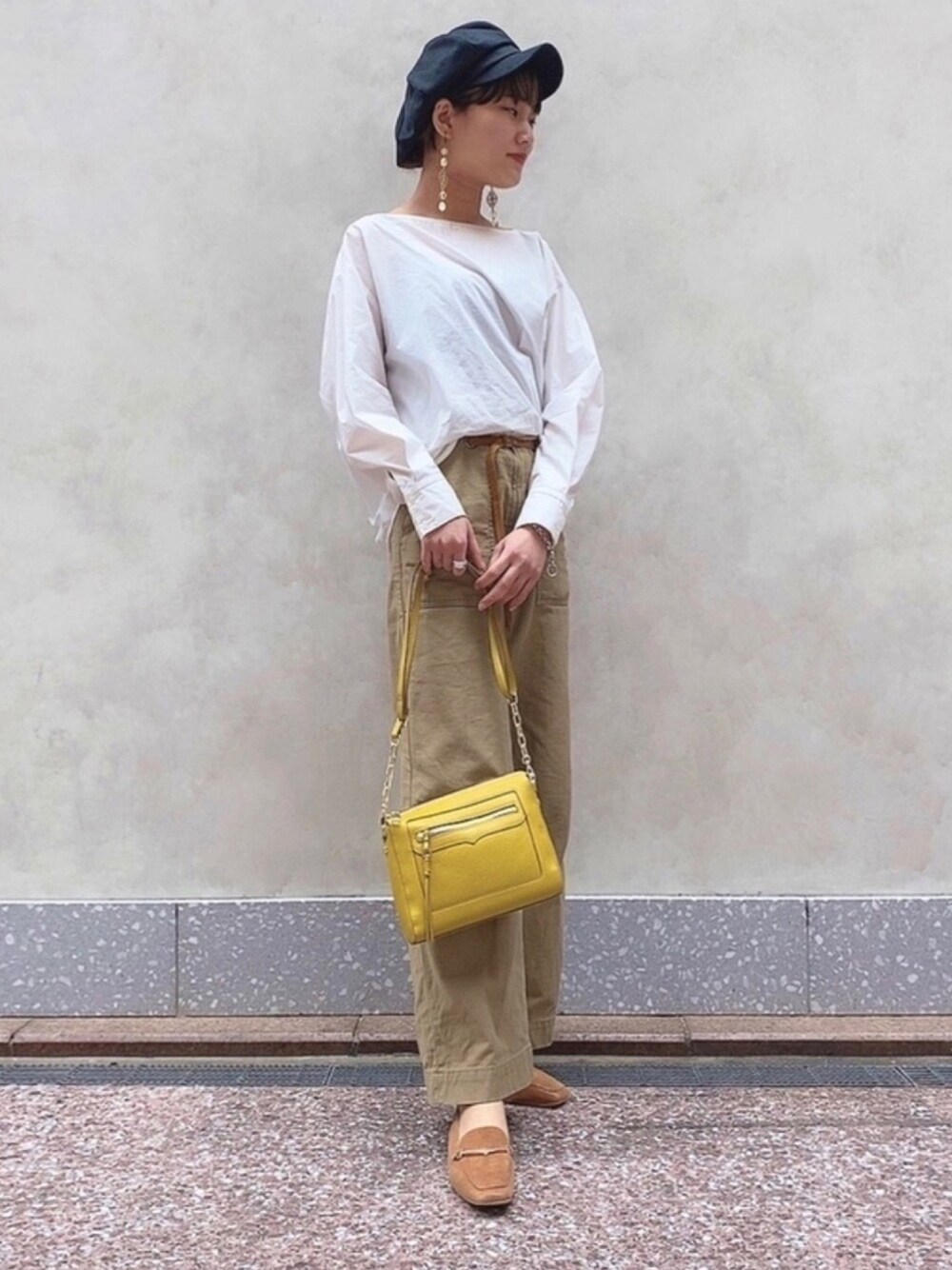 コーデがシンプルだったので、Bagとローファーは明るい色でワンポイントに。