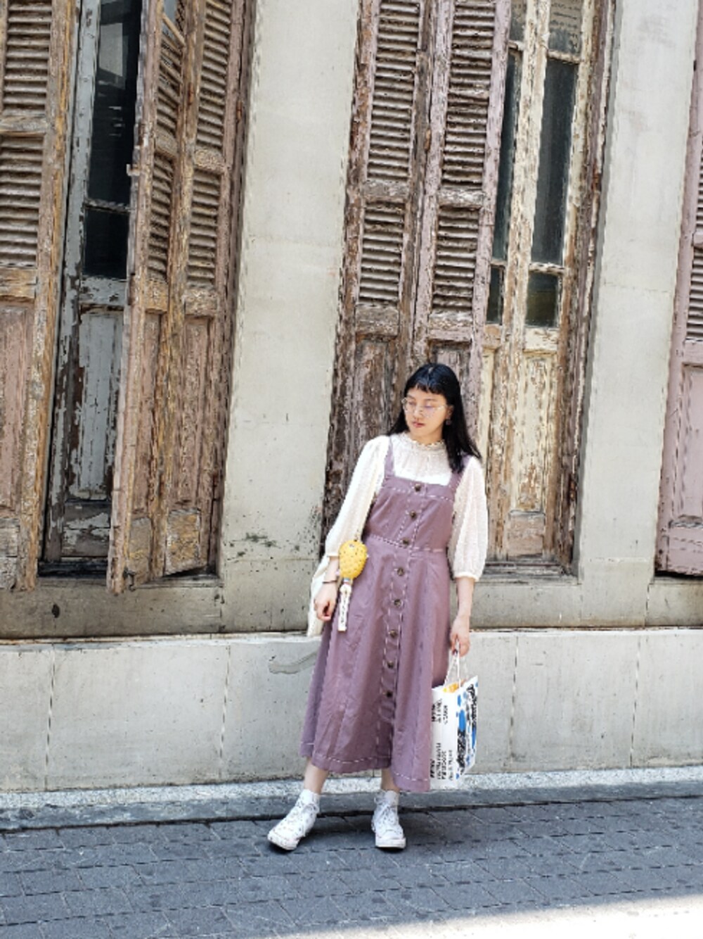 evenのスカート「フロントボタンジャンパースカート」を使ったコーディネート