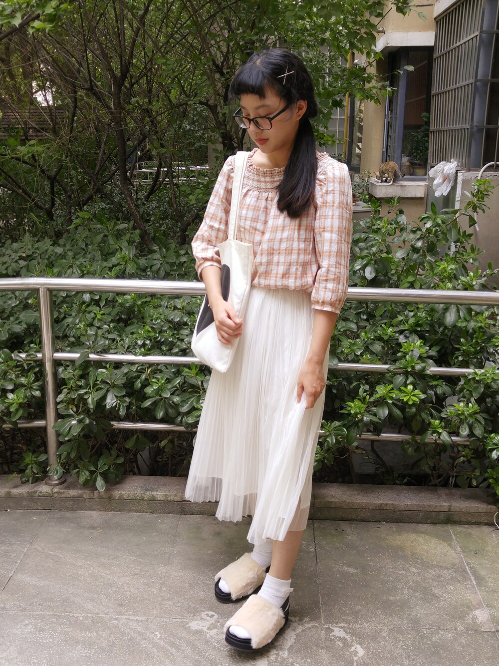 evenのシャツ/ブラウス「チェックスモッキング刺繍ブラウス」を使ったコーディネート