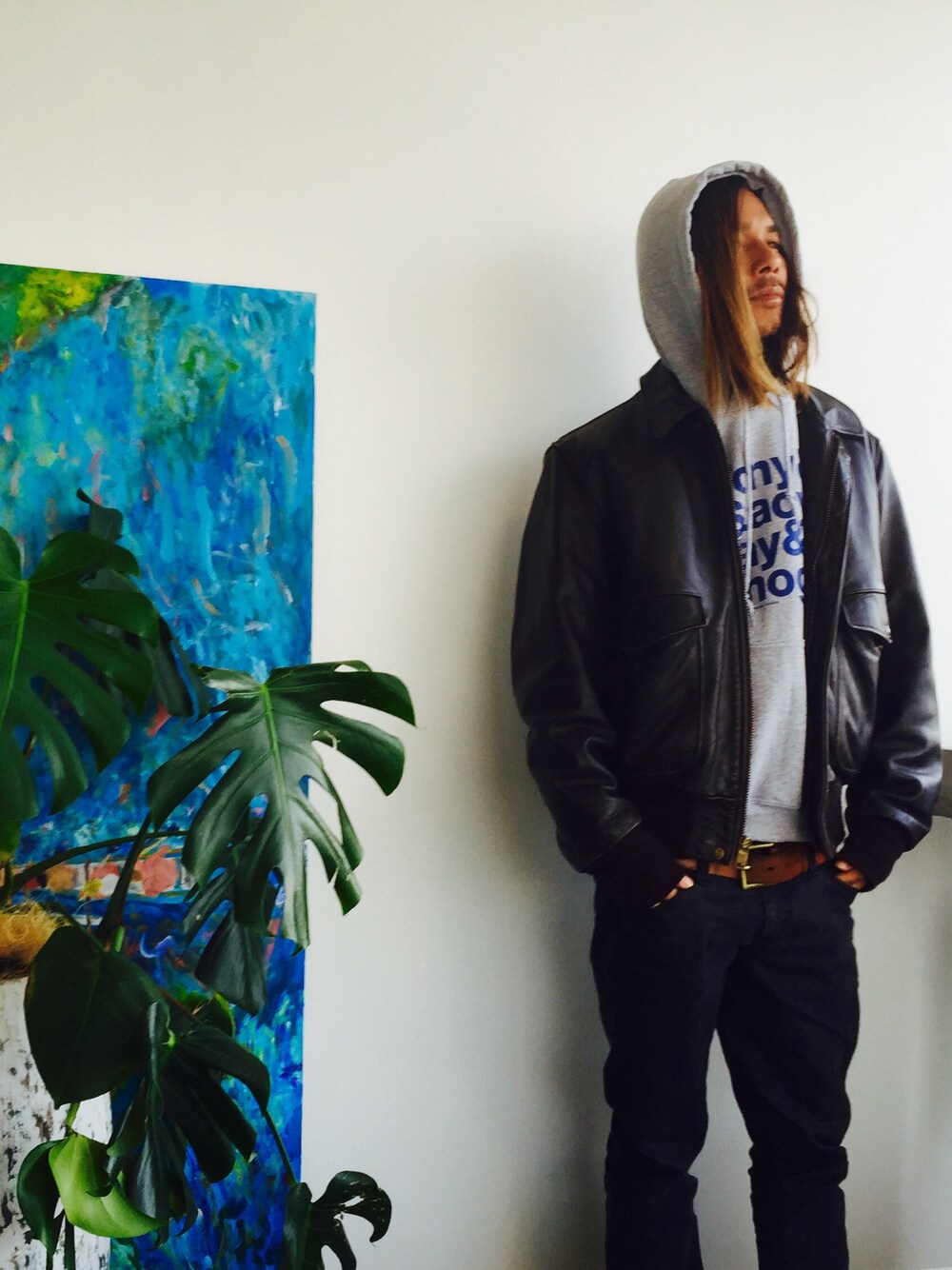 グレー系のパーカーを着用したメンズの冬コーディネートの1枚目の写真