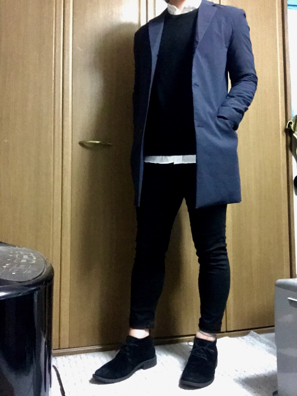 ネイビーチェスターコート➕モノトーン モノトーンベースでシャツレイヤード アイテムはUNIQLOとGUで✨