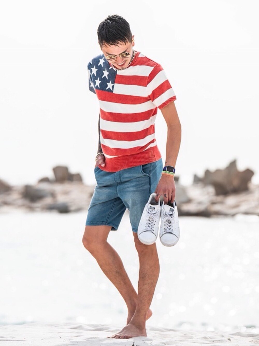 jokerスタッフ(joker)のニット/セーター「星条旗柄硫化染めジャガード半袖ニット セーター サマーニット」を使ったコーディネート