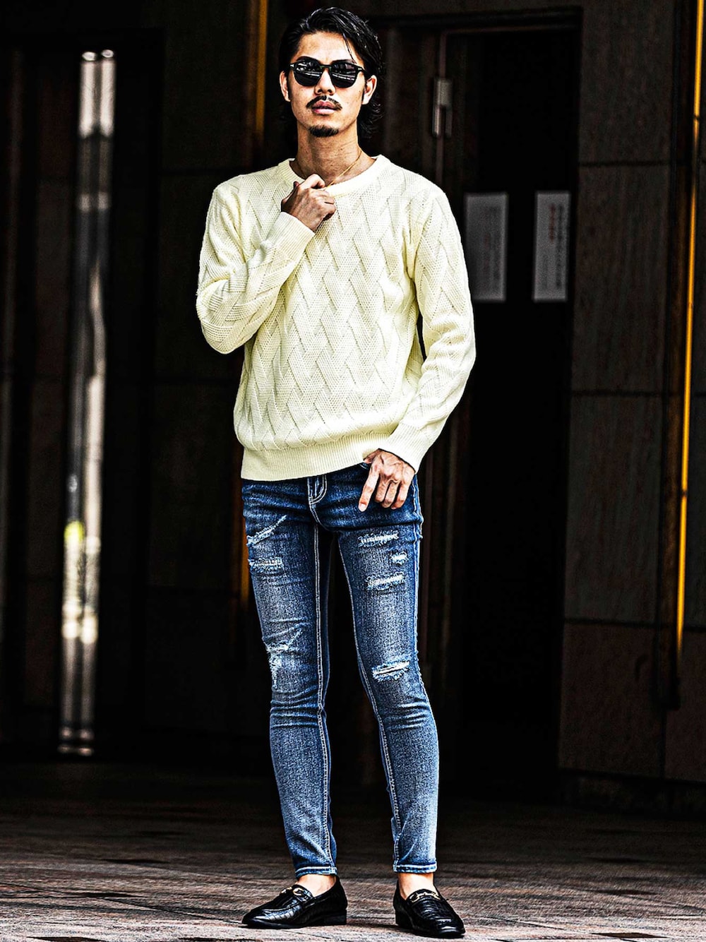 jokerスタッフ(joker)のニット/セーター「【SOMEDIFF】変わり編み長袖ケーブルニットセーター メンズ クルーネックニット タイト モックネックニット セーター リブ タイト 春服」を使ったコーディネート