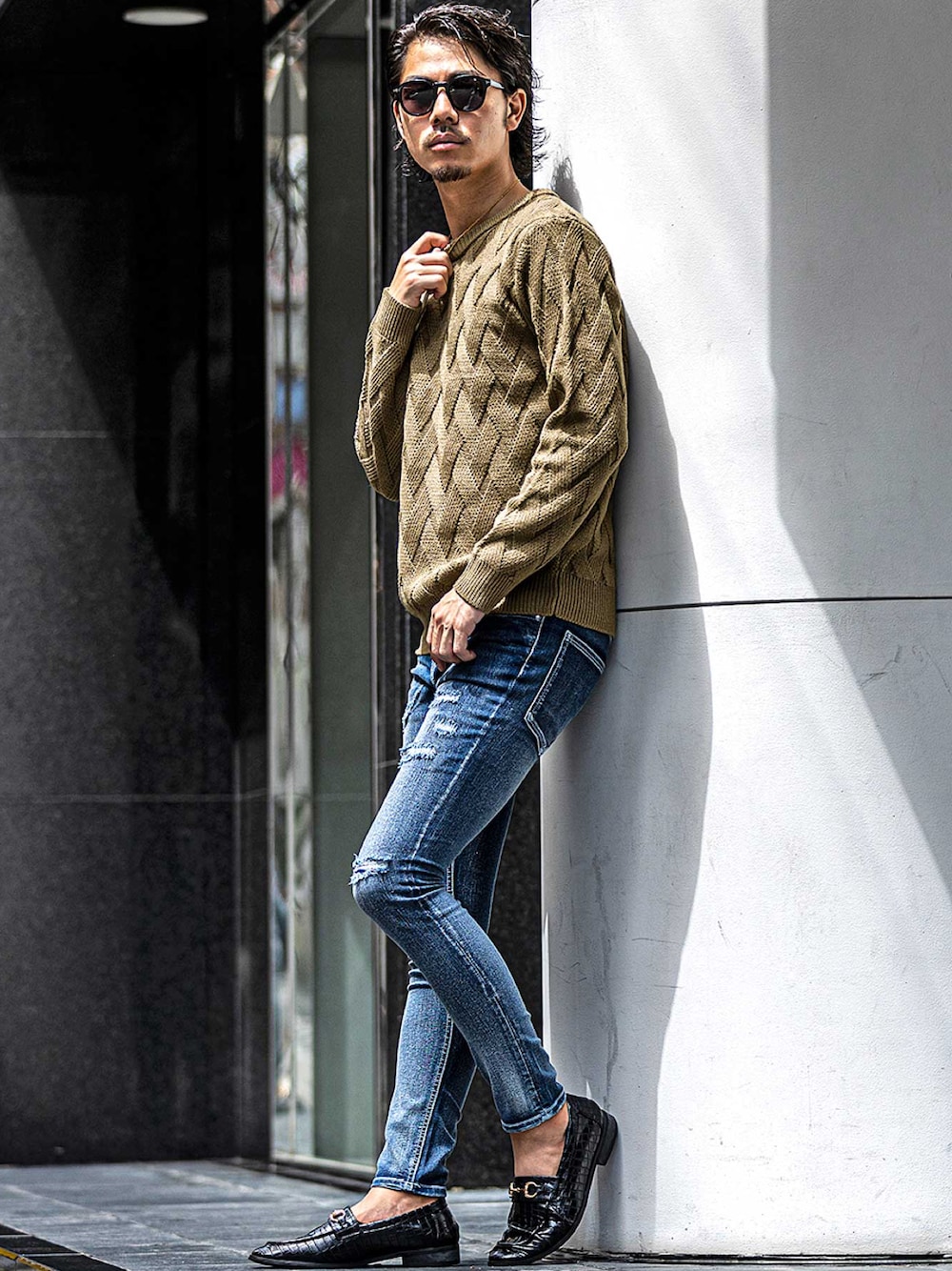jokerスタッフ(joker)のニット/セーター「【SOMEDIFF】変わり編み長袖ケーブルニットセーター メンズ クルーネックニット タイト モックネックニット セーター リブ タイト 春服」を使ったコーディネート