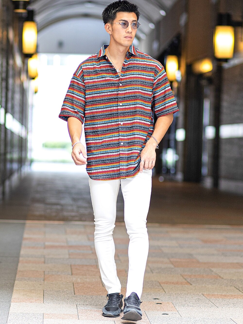『180cm/76kg 筋肉質体型』 いつも、いいね♡フォロー👍 ありがとうございます🤗 ■柄もので遊ぶ洒落感コーデ 総柄のネイティブ柄でデザインされたオーバーサイズシャツに、細身のスキニーパンツを合わせたコーデ。 夏っぽく映える柄を身に纏うことで、コーデにこなれ感が出るだけでなく存在感も増して良いですね! トップスはビッグシルエット、ボトムスはタイトシルエットのアイテムを採用することで、Yシルエットになってバランスよく見えるのもおすすめポイントです! 身体の大きな方でもチャレンジできるので、是非試してみてください!