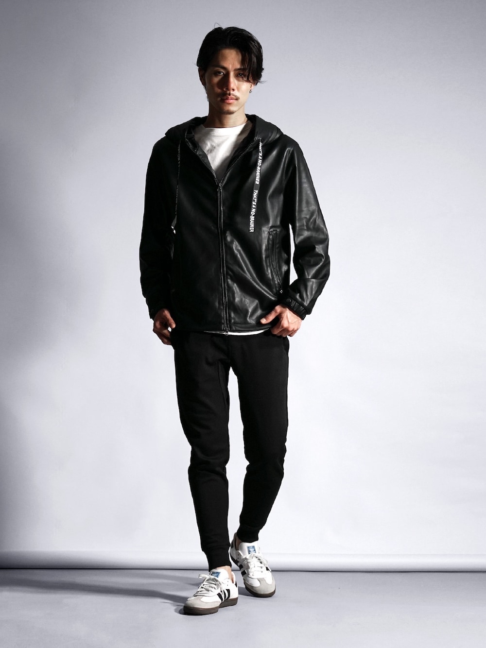 ブラック系のアイテムでまとめたコーデ。 フェイクレザーの艶感で大人らしさを表現し、ピッタリサイズのジョガーパンツでカジュアルな雰囲気も演出。