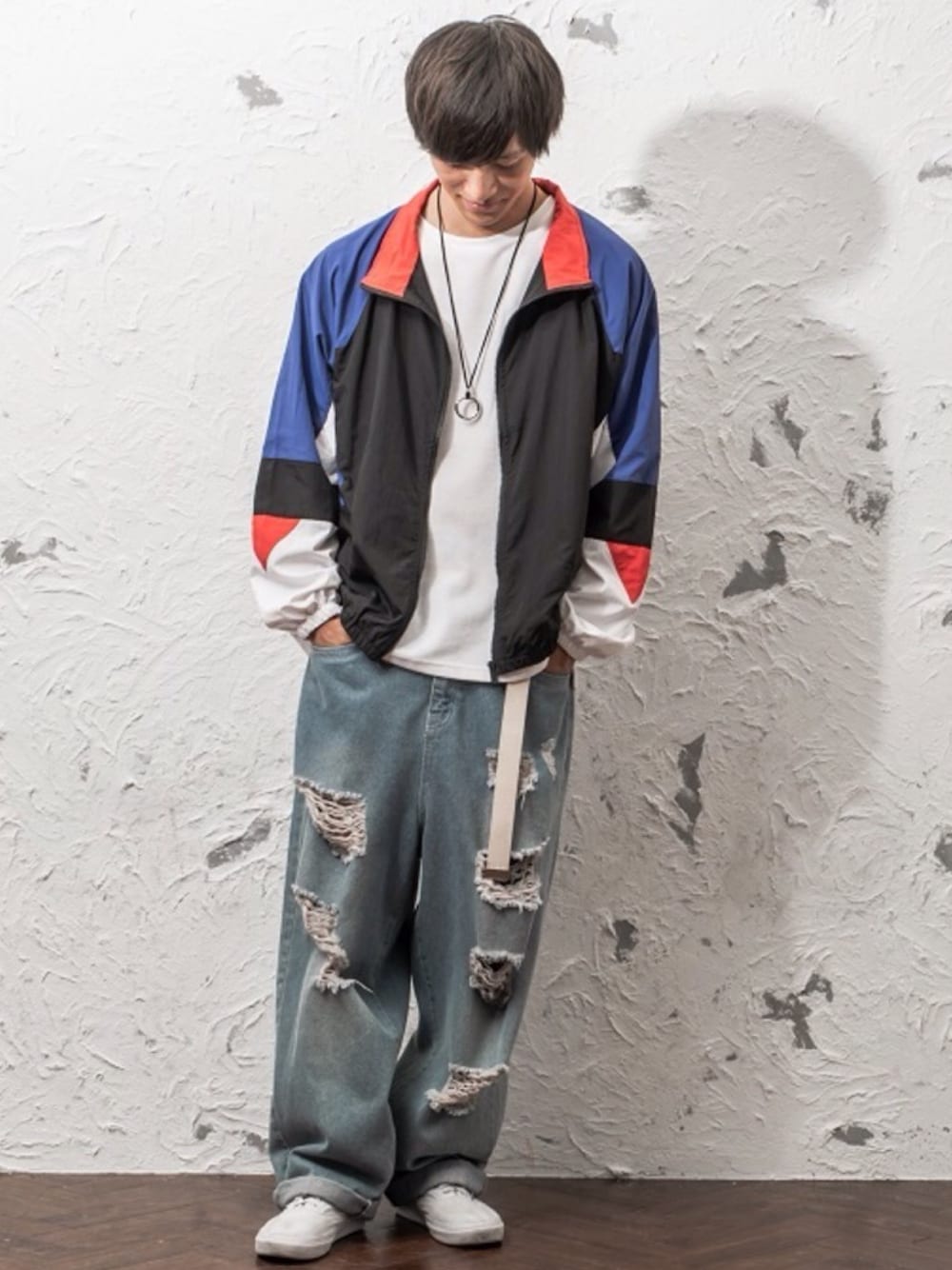 REONのナイロンジャケット「パネルナイロンウインドブレーカー」を使ったコーディネート