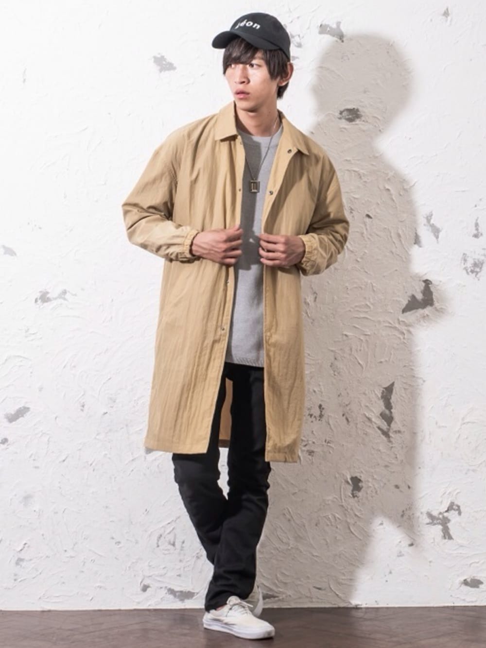 REONのステンカラーコート「メンズナイロンワッシャーステンカラーコート」を使ったコーディネート
